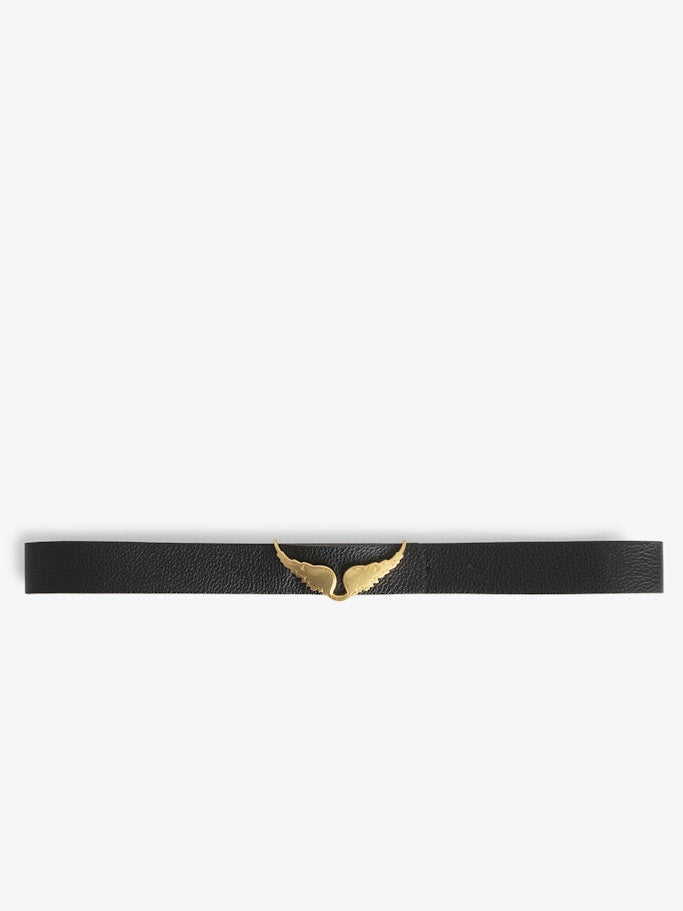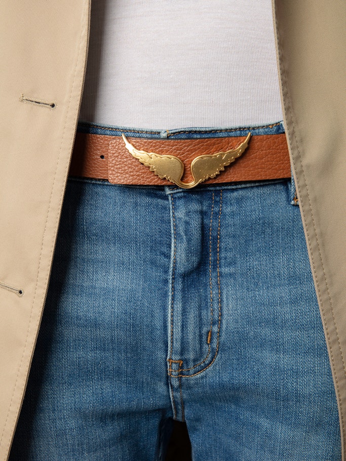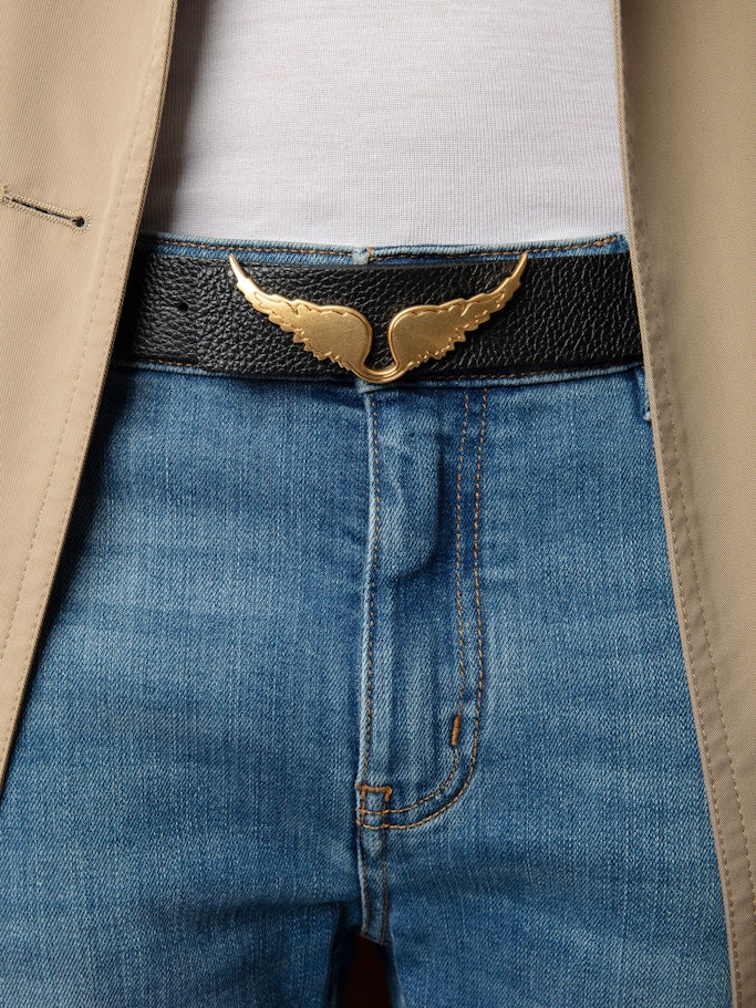 - Zlatá přezka zdobená charakteristickými křídly