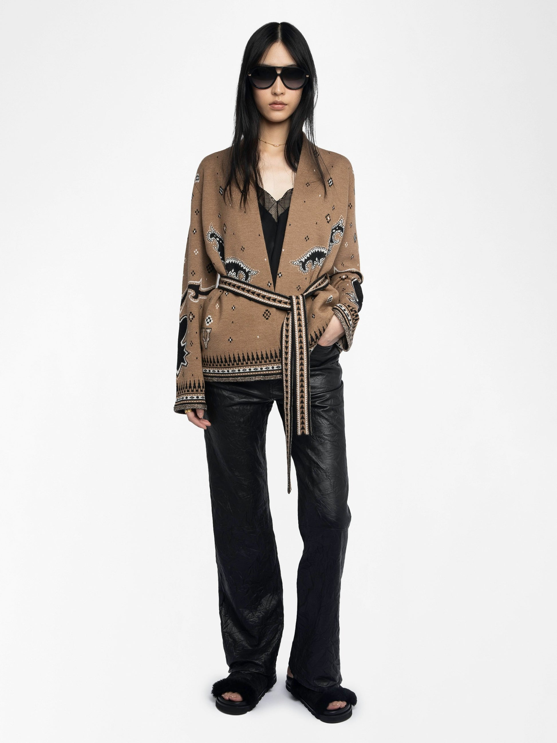 - Kardiganová vesta ze 100% merino vlny - Elektronický žakár - Zavinovací zapínání s páskem - Dlouhé rukávy