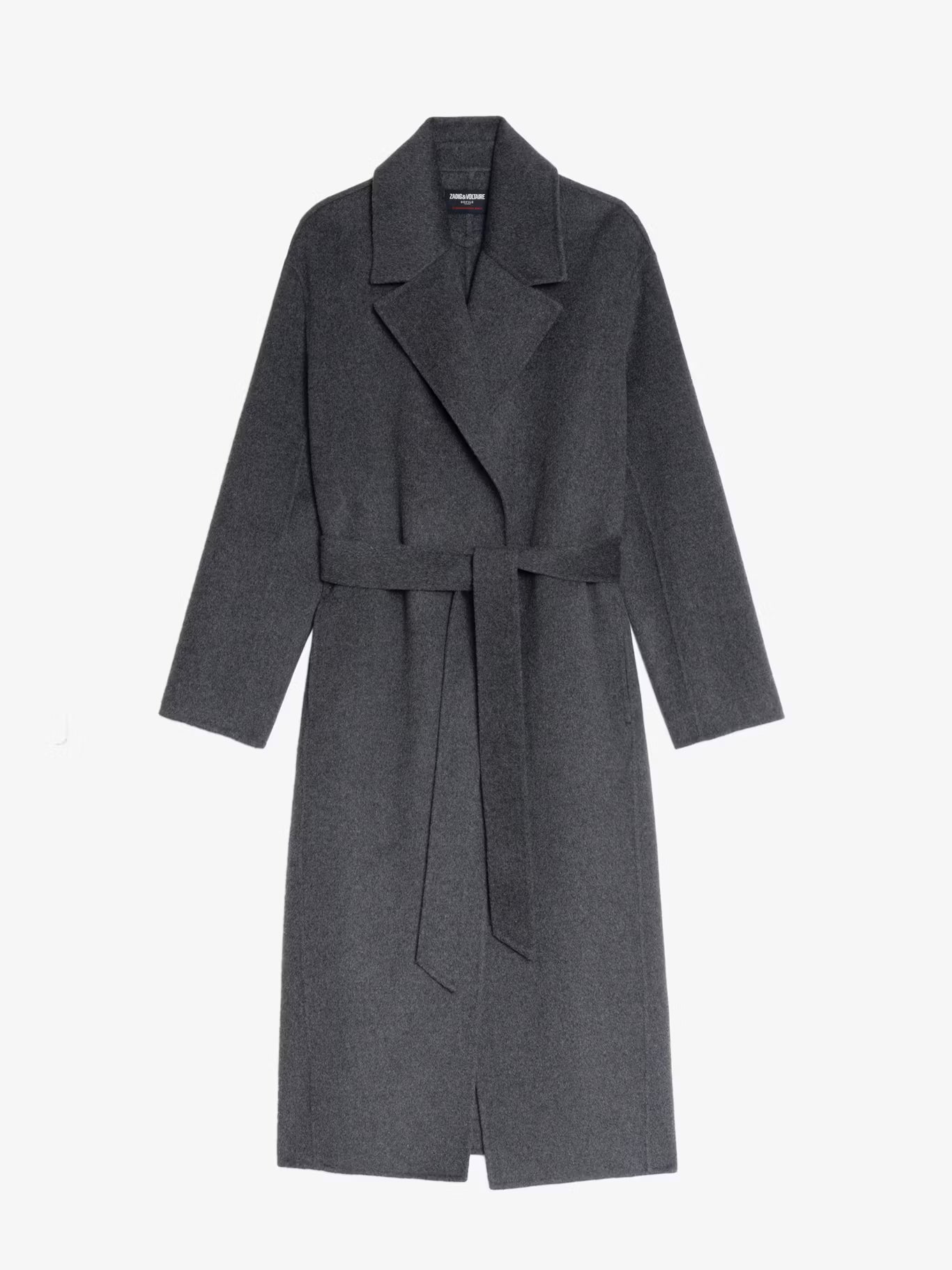 Dlouhý kabát ve stylu županu, s páskem v pase a dlouhými rukávy.