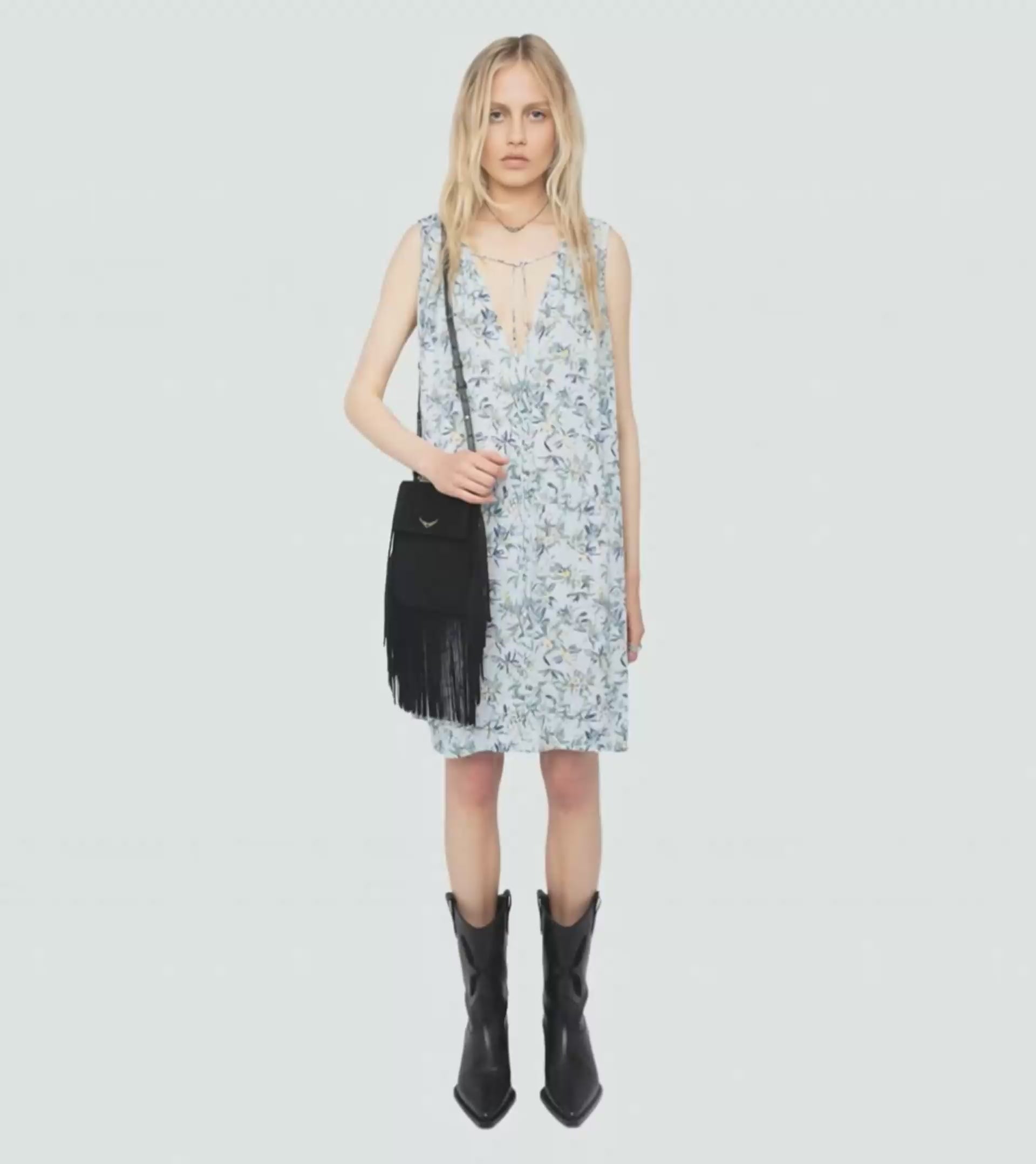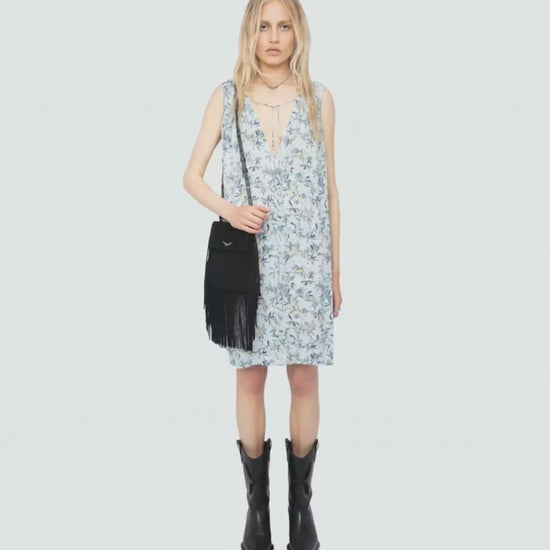 Krátké tištěné viskózové šaty, bez rukávů, šňůrka s křídly a odnímatelný pásek.