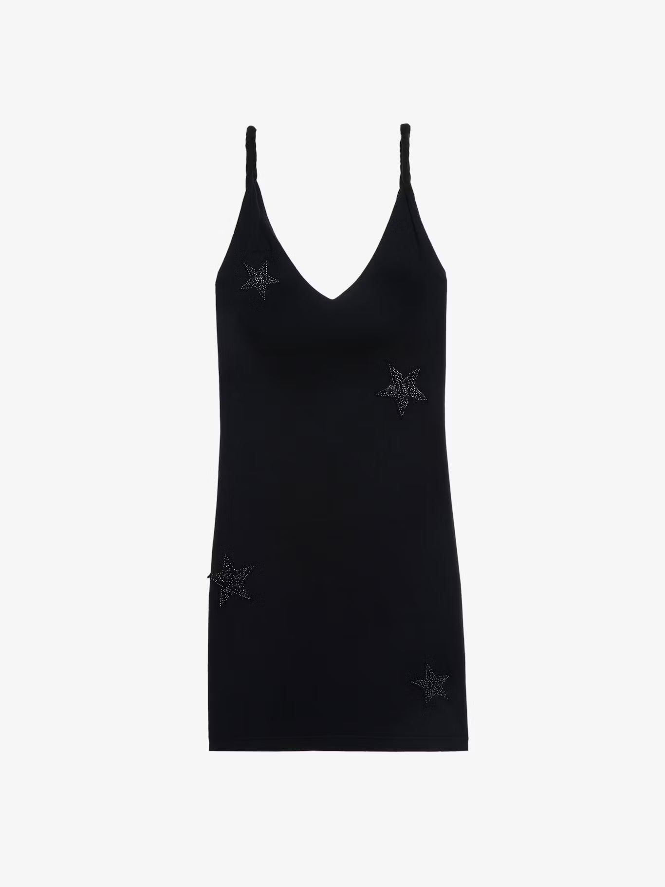 Dámské černé šaty bez rukávů s diamantovými hvězdami.