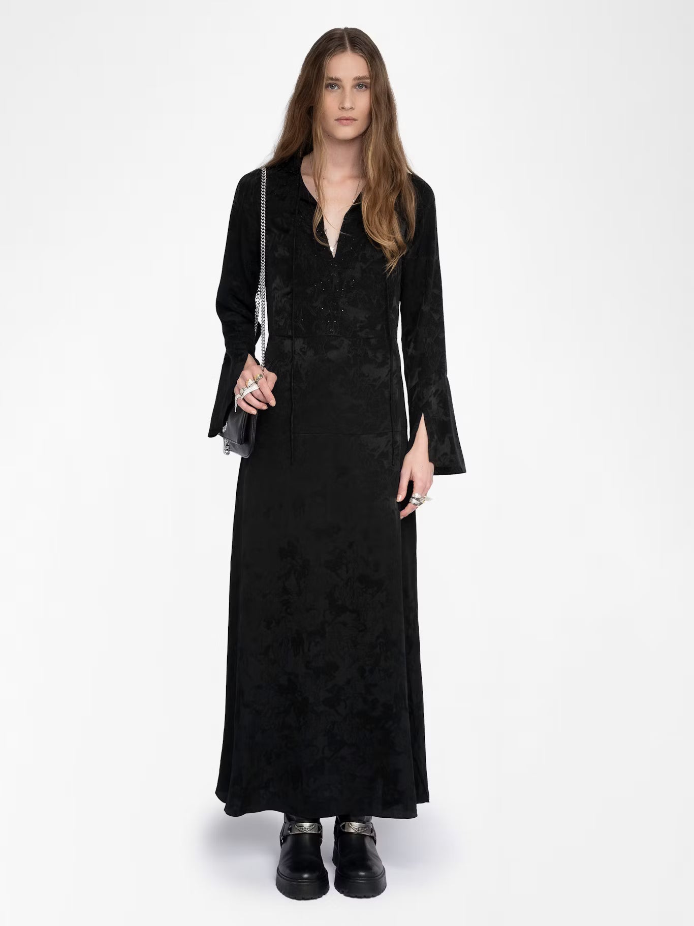 Dlouhé šaty z žakárového hedvábí s motivem koní, s dlouhými rukávy, bočními rozparky a šněrovacím výstřihem.
