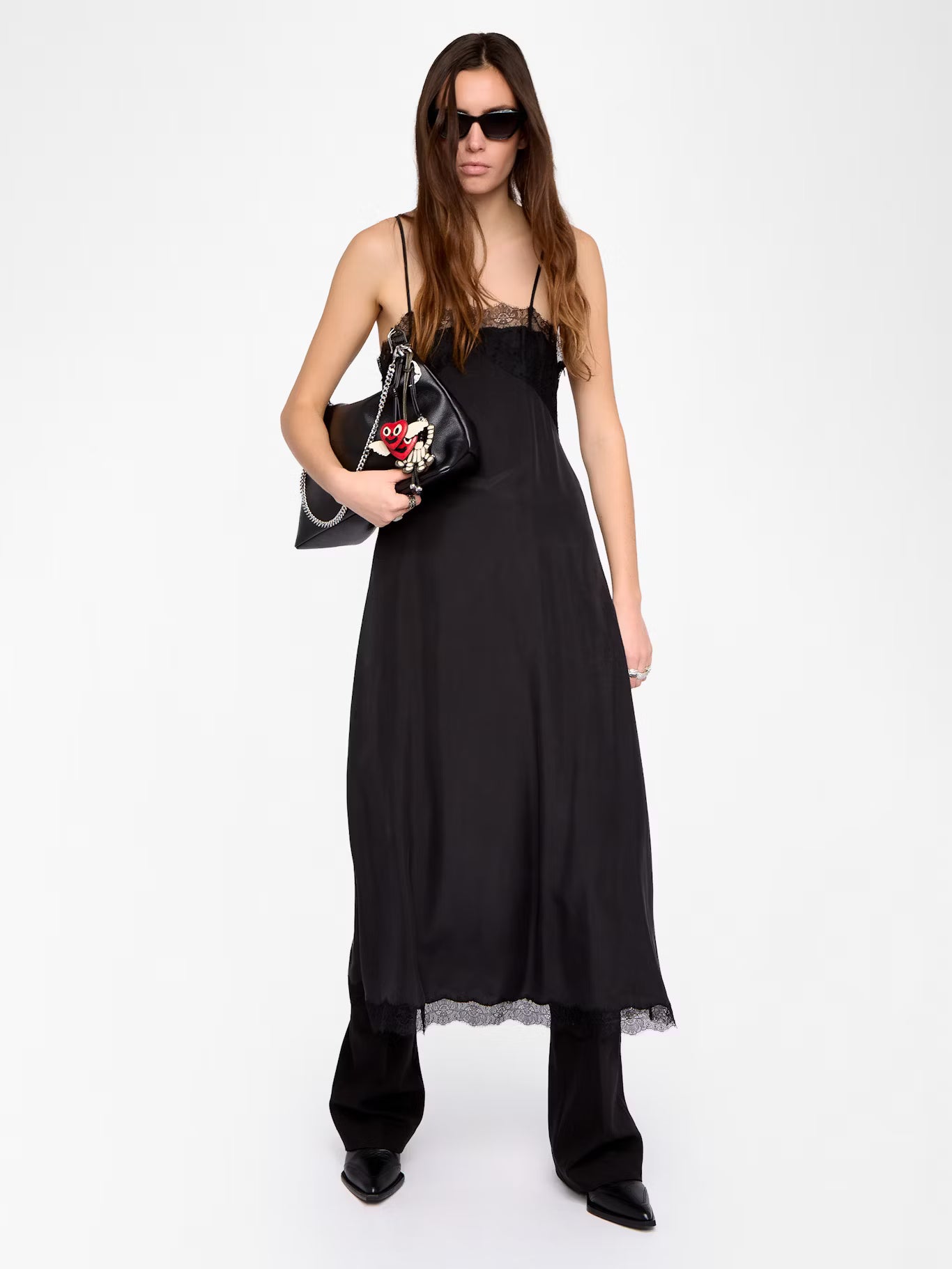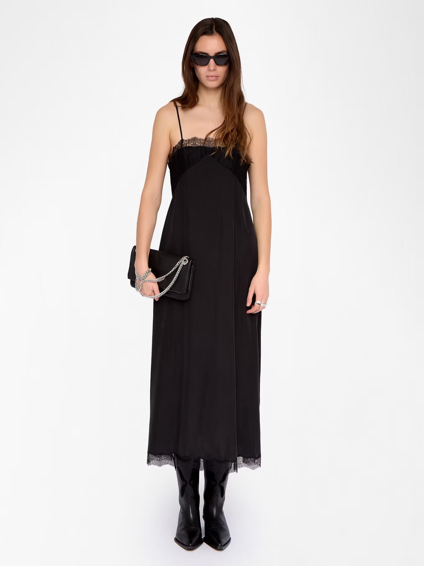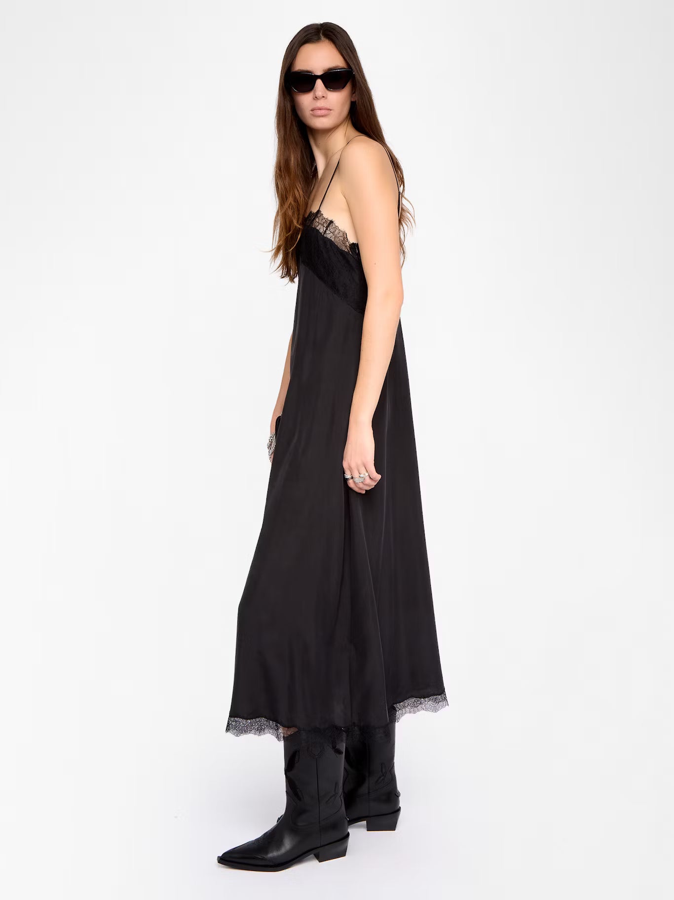 Hedvábné šaty střední délky s efektem spodního prádla, nastavitelnými ramínky a krajkou v oblasti hrudníku a spodní části těla.