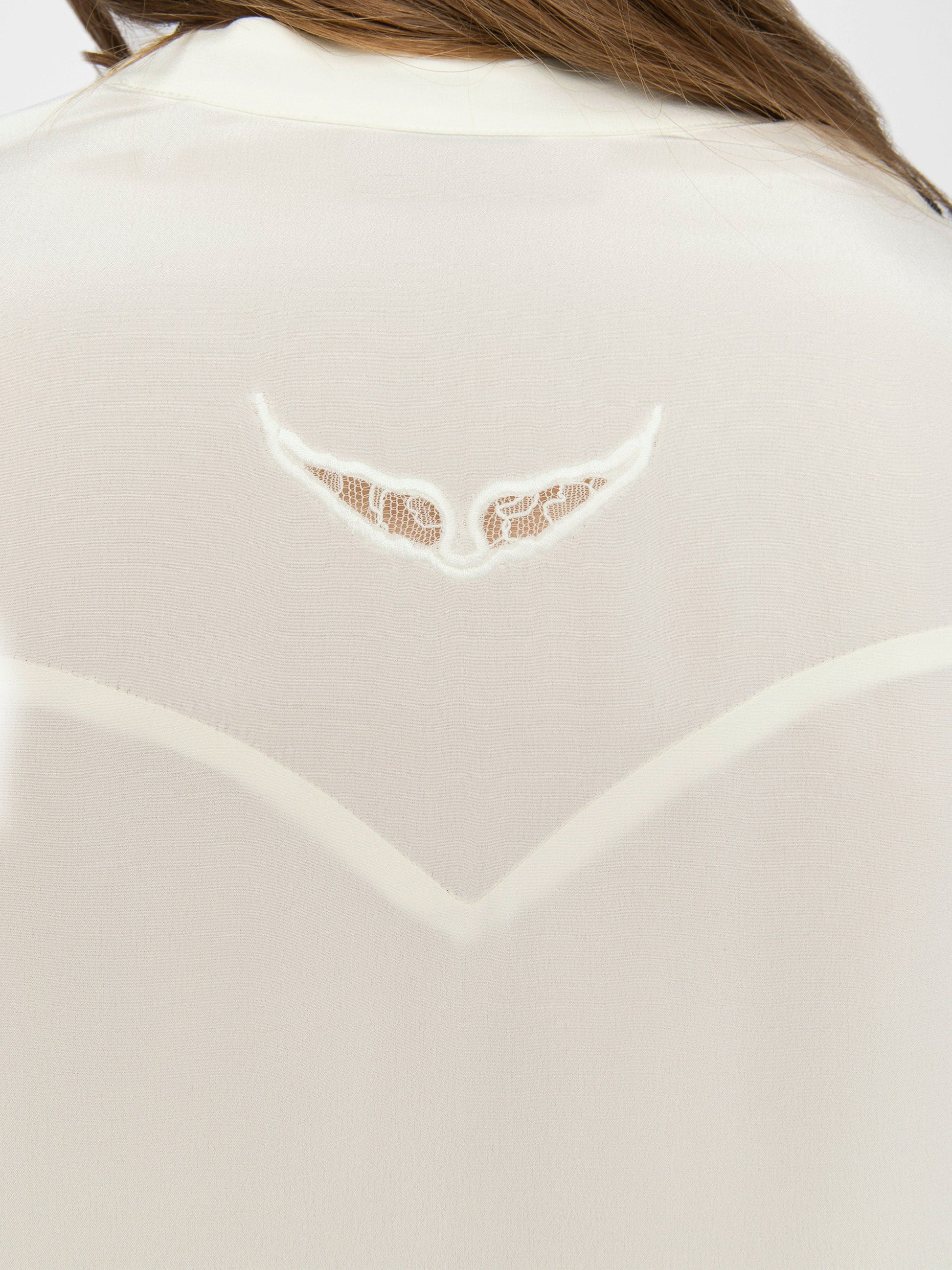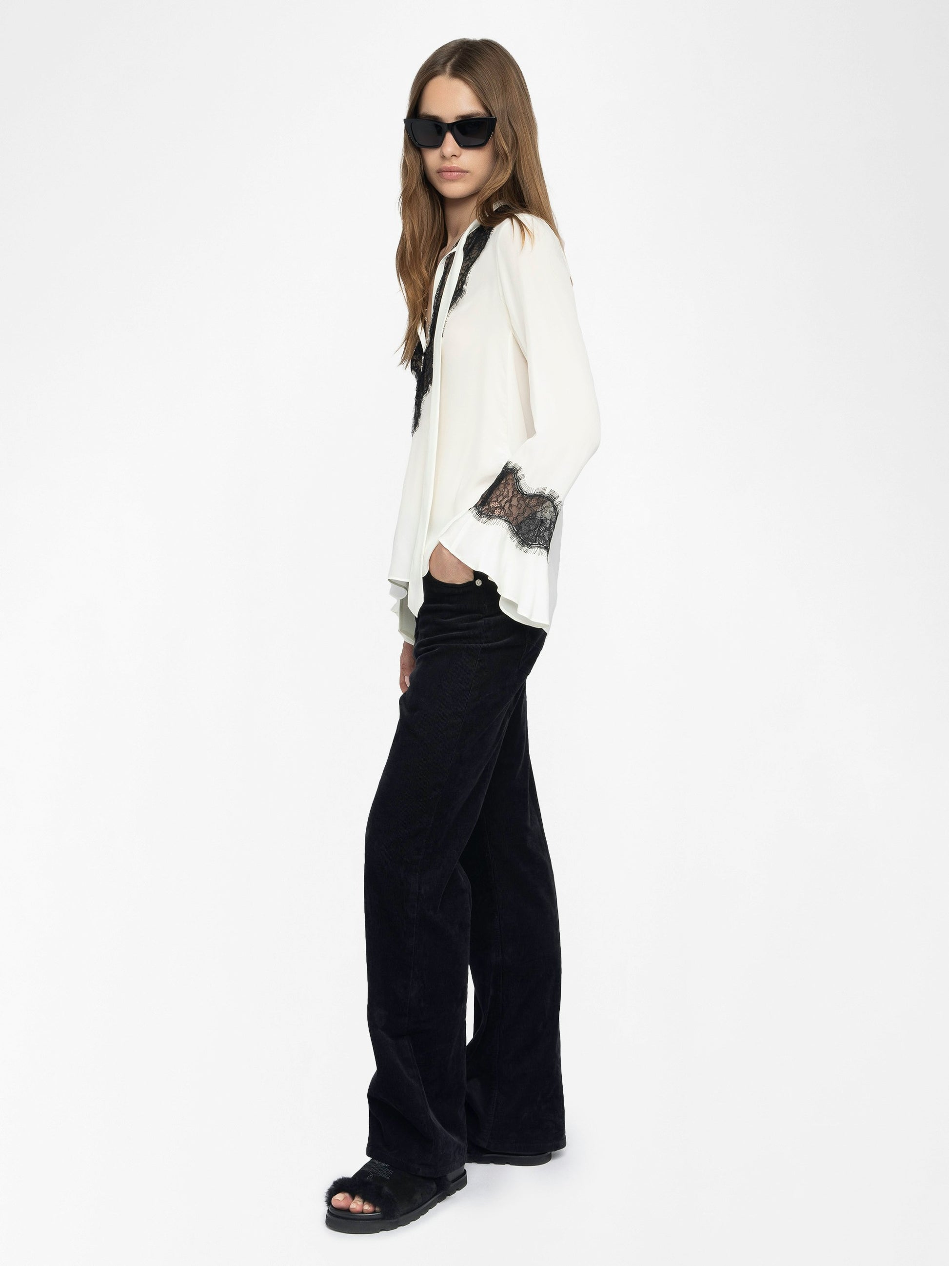 - Dámský top s dlouhým rukávem - Kontrastní černý krajkový lem na výstřihu a rukávech - Hluboký výstřih do V s zavazováním - Dlouhé rozšířené rukávy