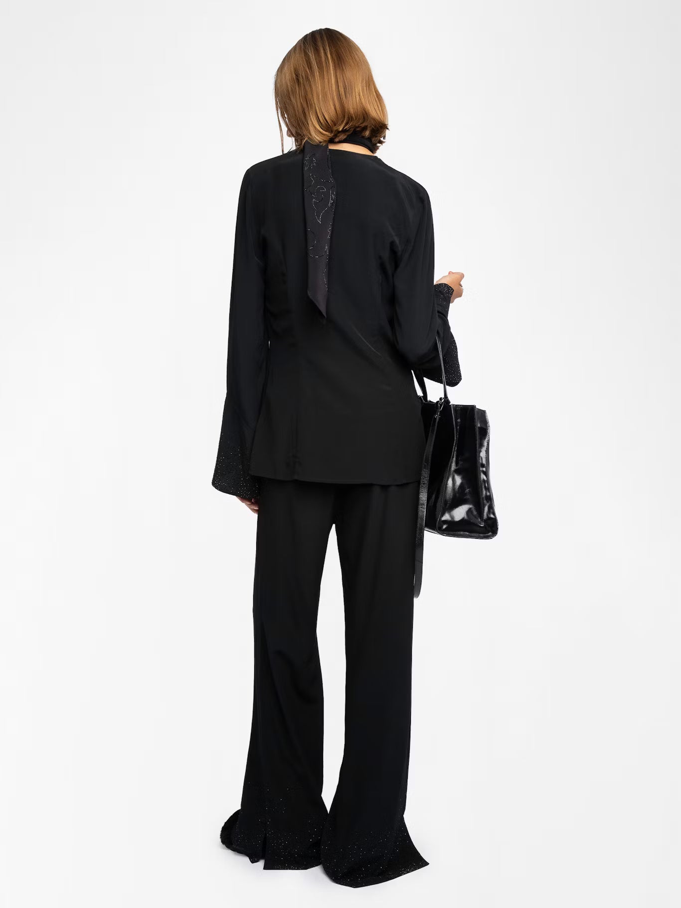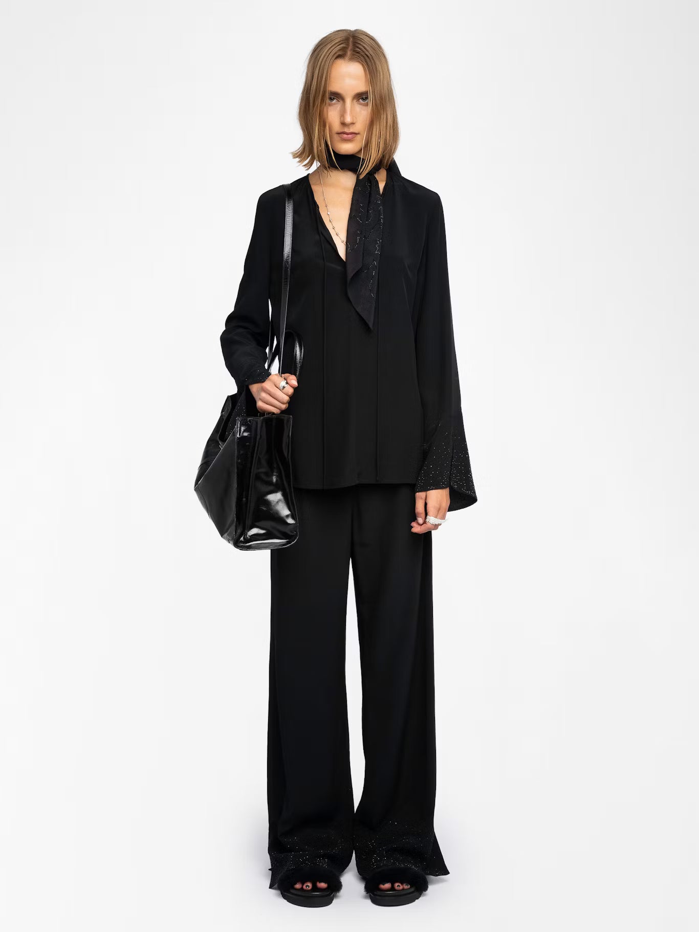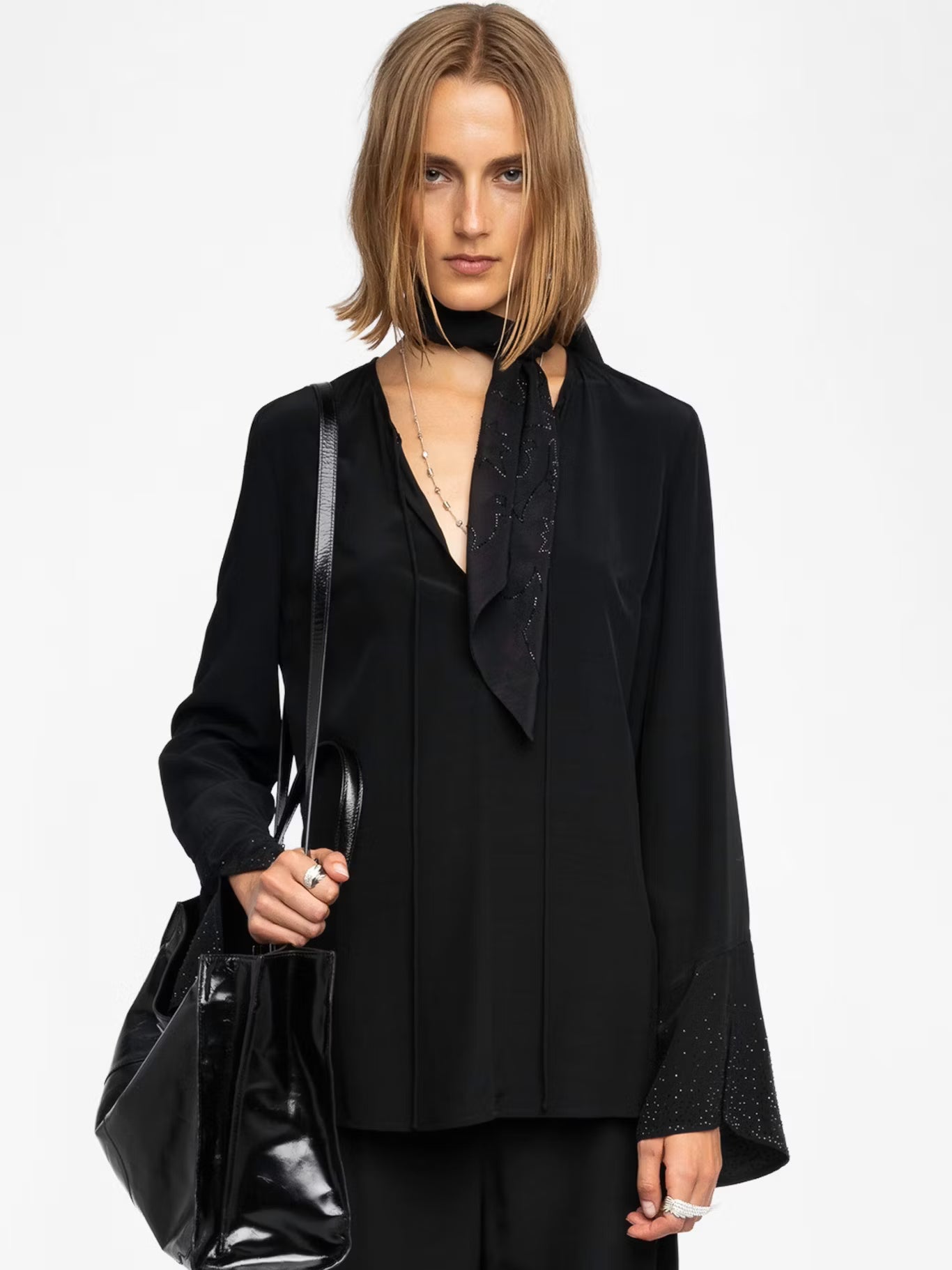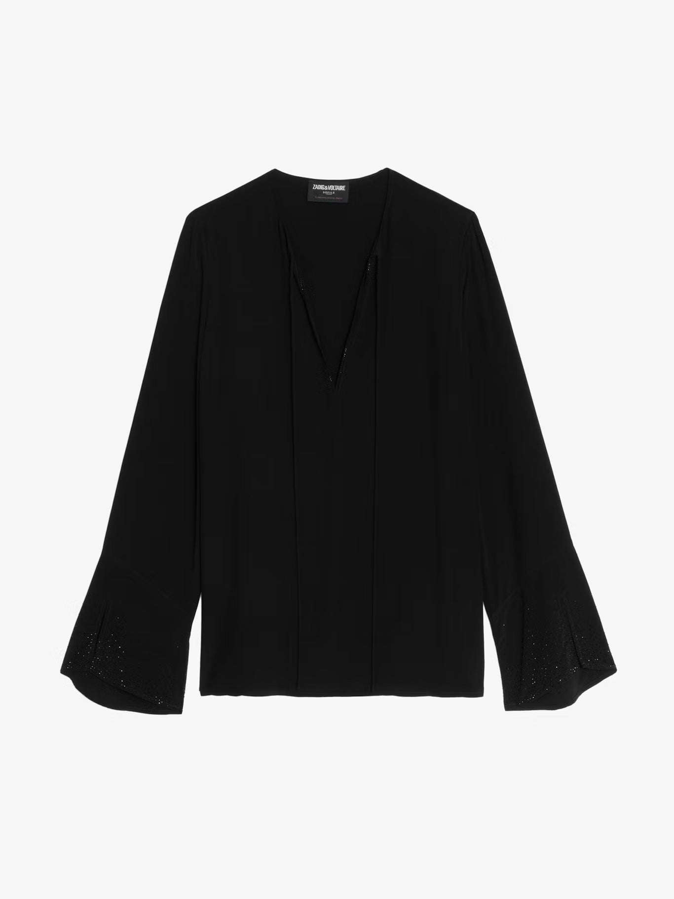 Viskózová halenka s kamínky, dlouhými rukávy a výstřihem.
