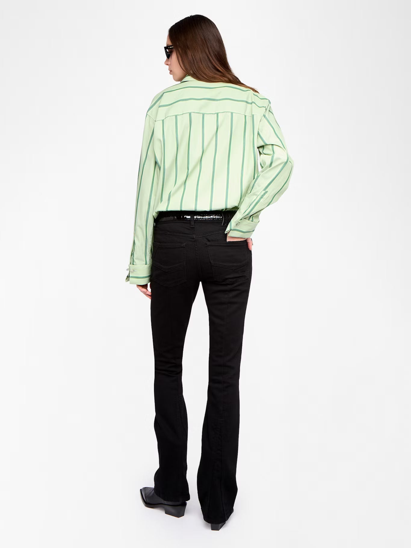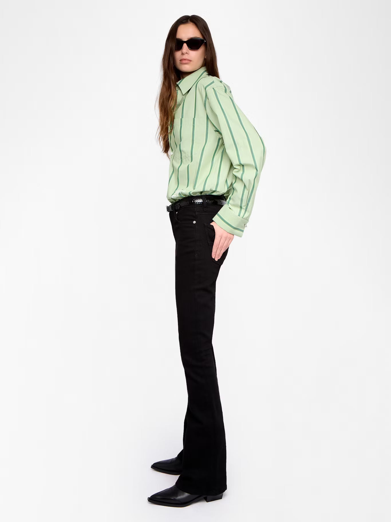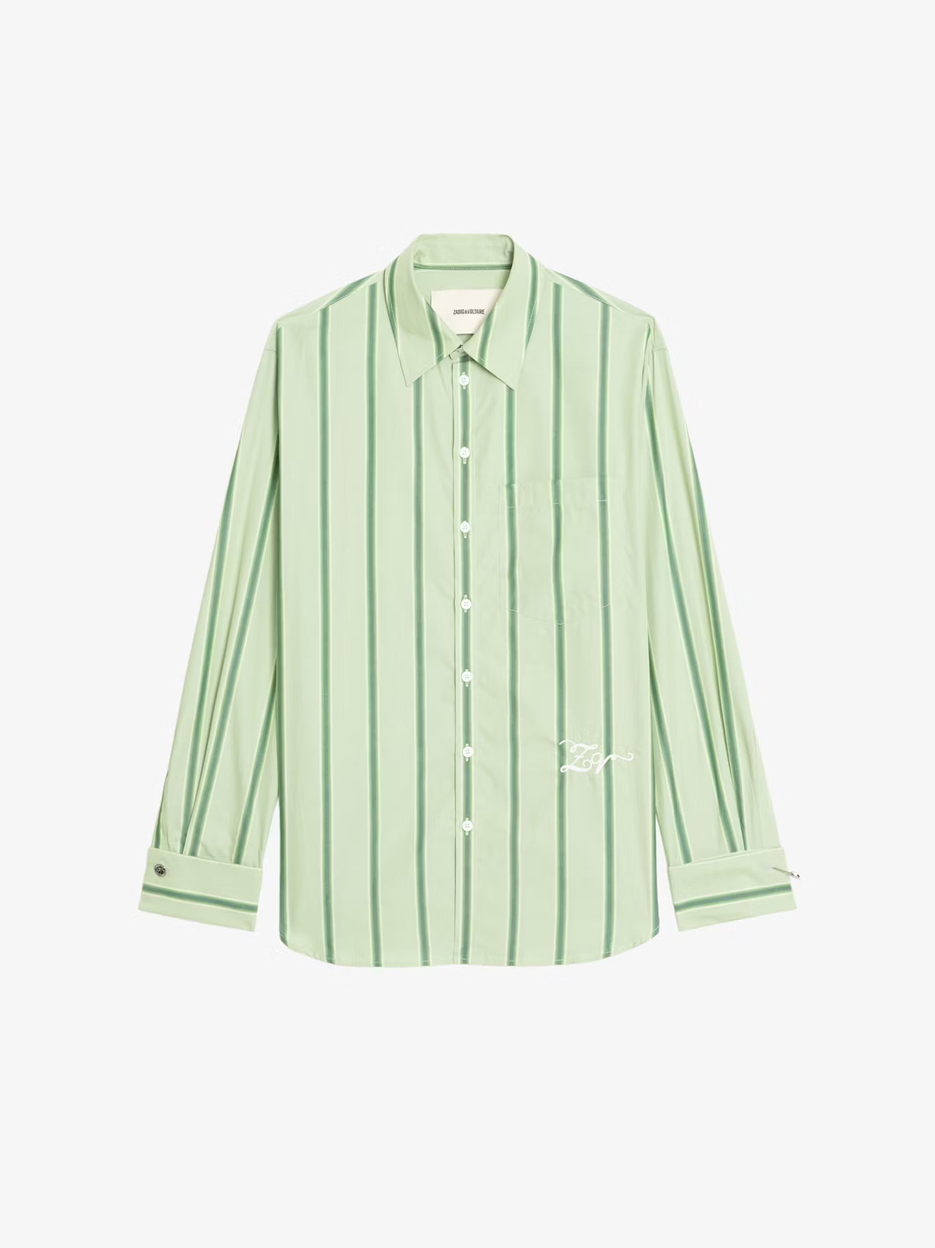 Volná košile z pruhovaného popelínu, nakládaná kapsa na hrudi, vyšívaná manžeta a knoflíková dírka.
