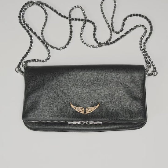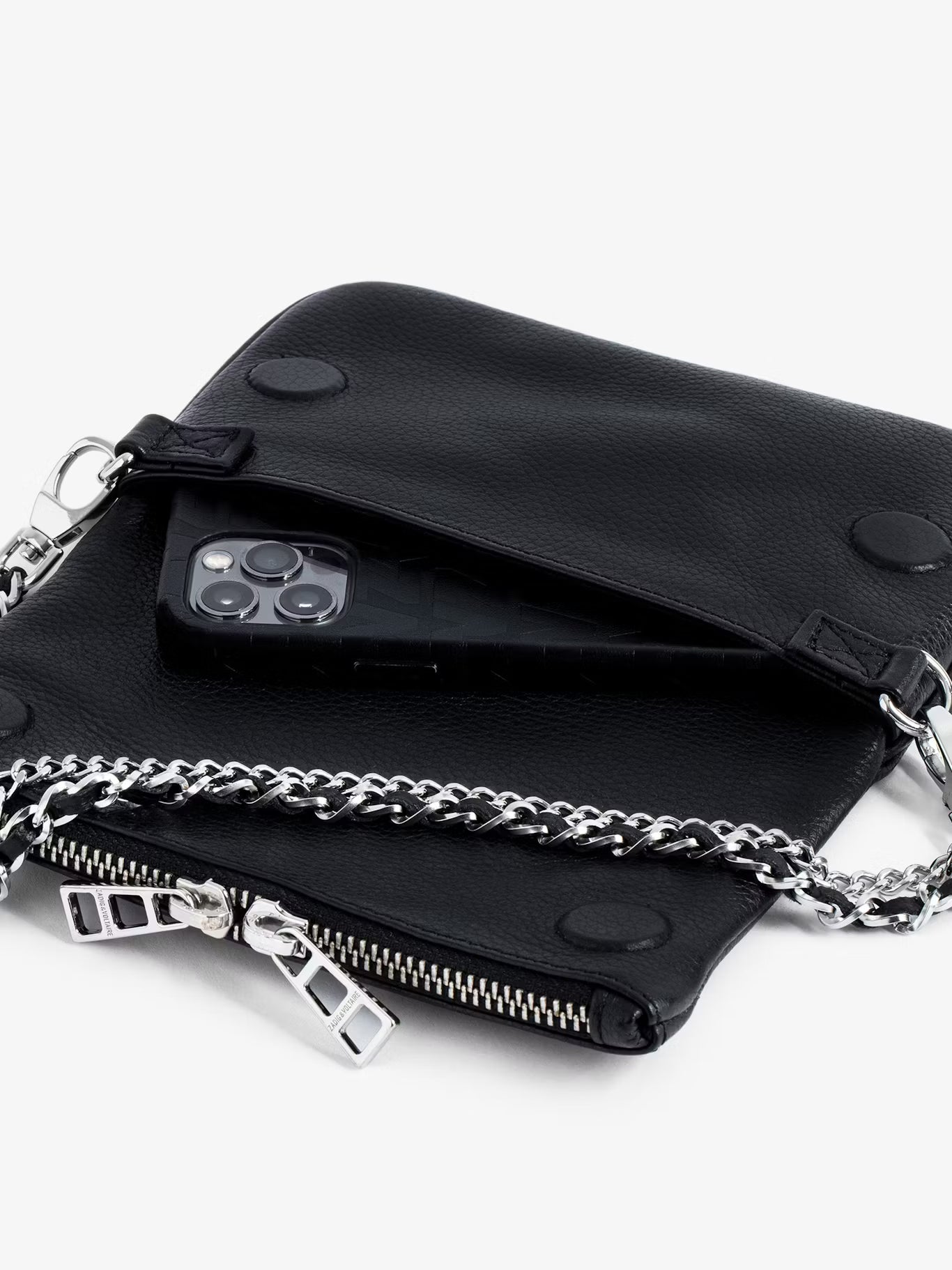 Pouzdro Rock Nano Swing Your Wings z černé kůže s texturovanou texturou a koženým ramenním popruhem s řetízkem.