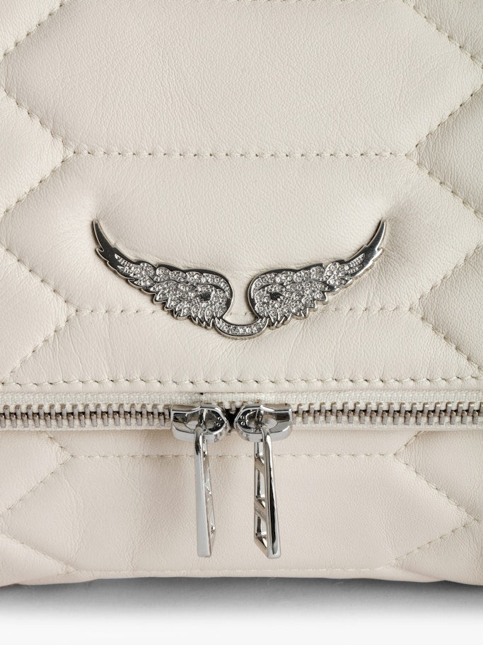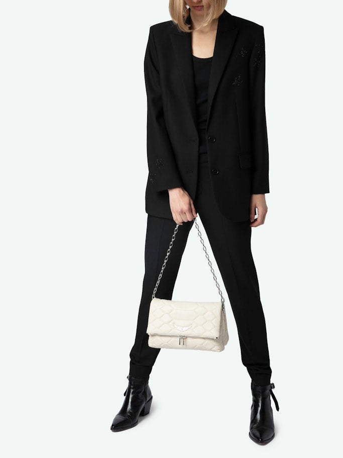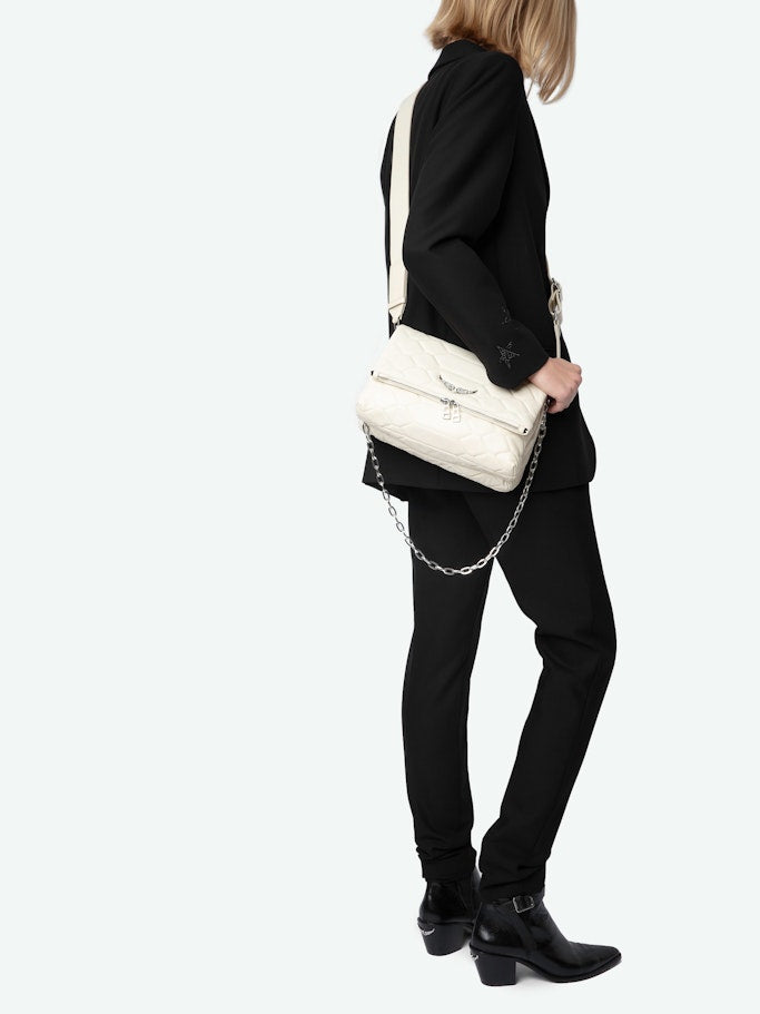 Quilted smooth leather bag with snake scale pattern and shoulder strap.
