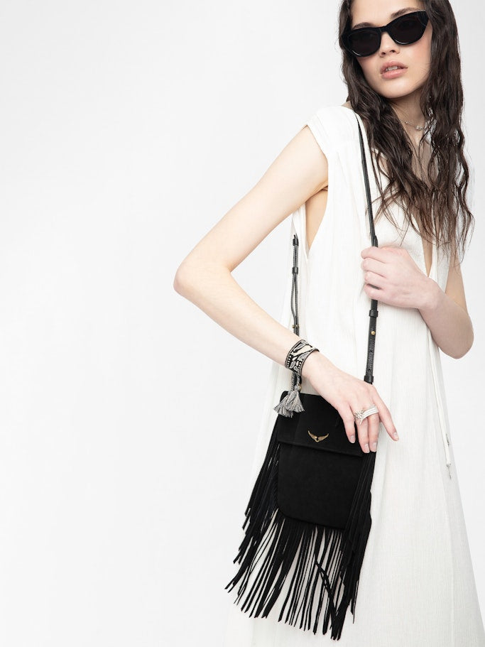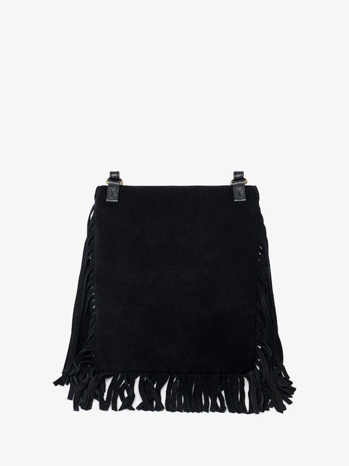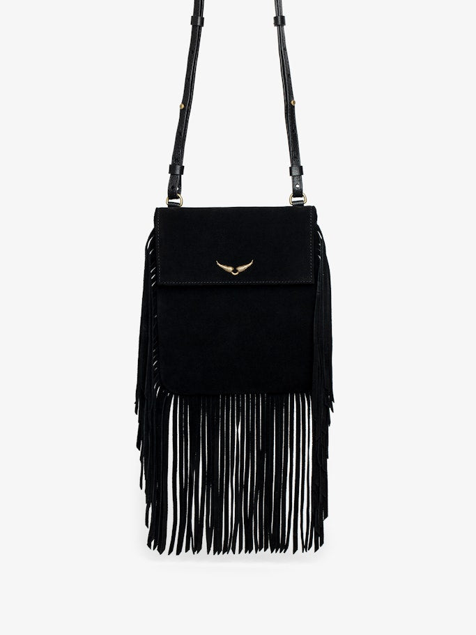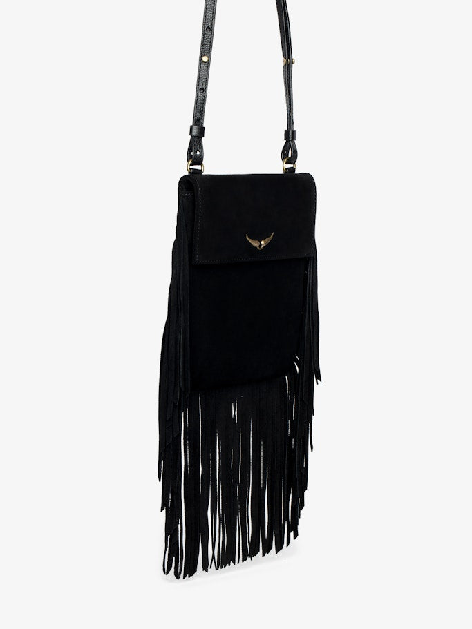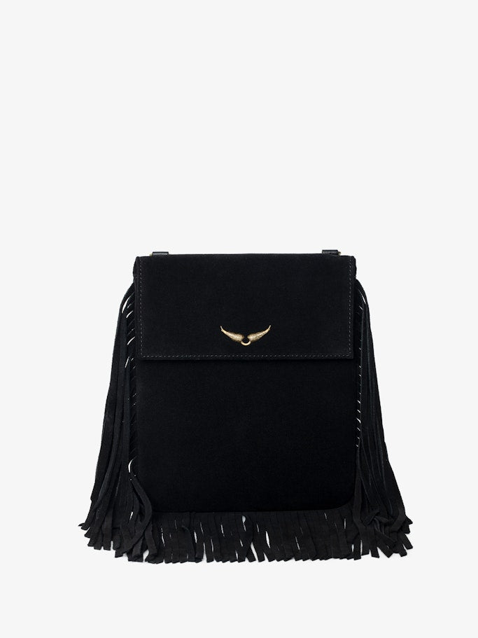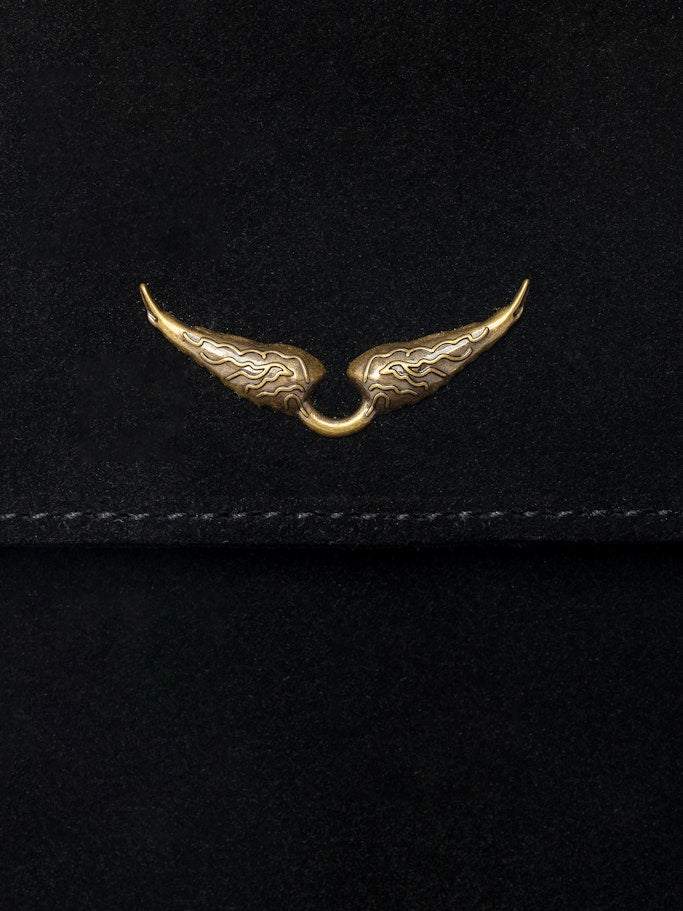 Semišová kabelka s charakteristickými křidélky a ramenním popruhem.