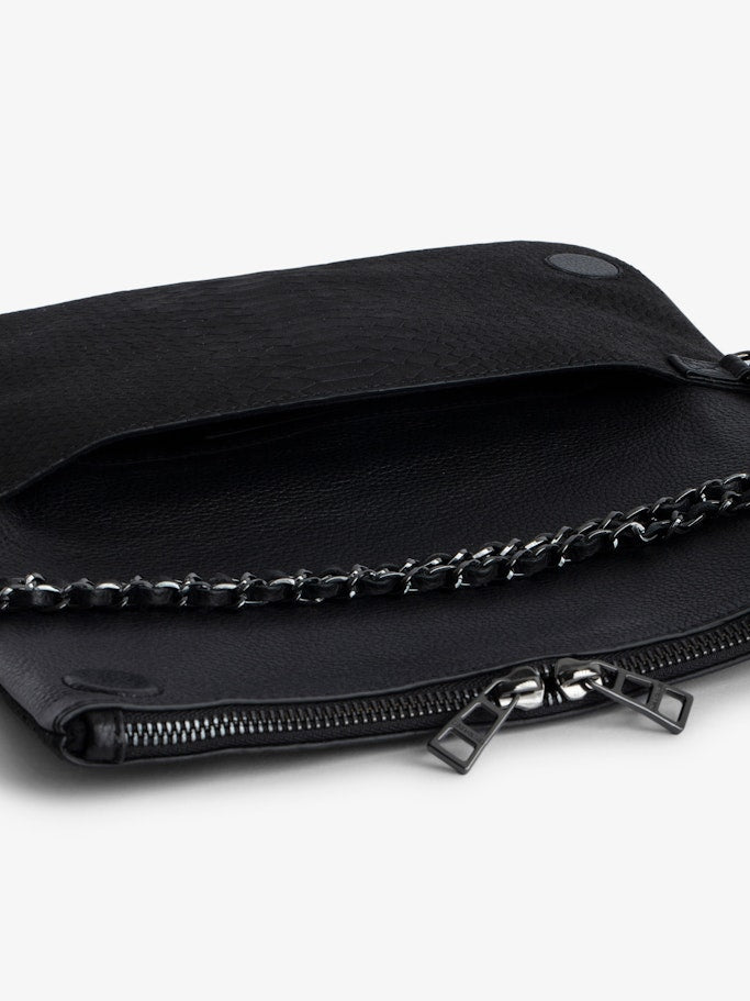 Kožená spojka s pythoním efektem a dvojitým řetízkem propleteným kůží a kovem.
