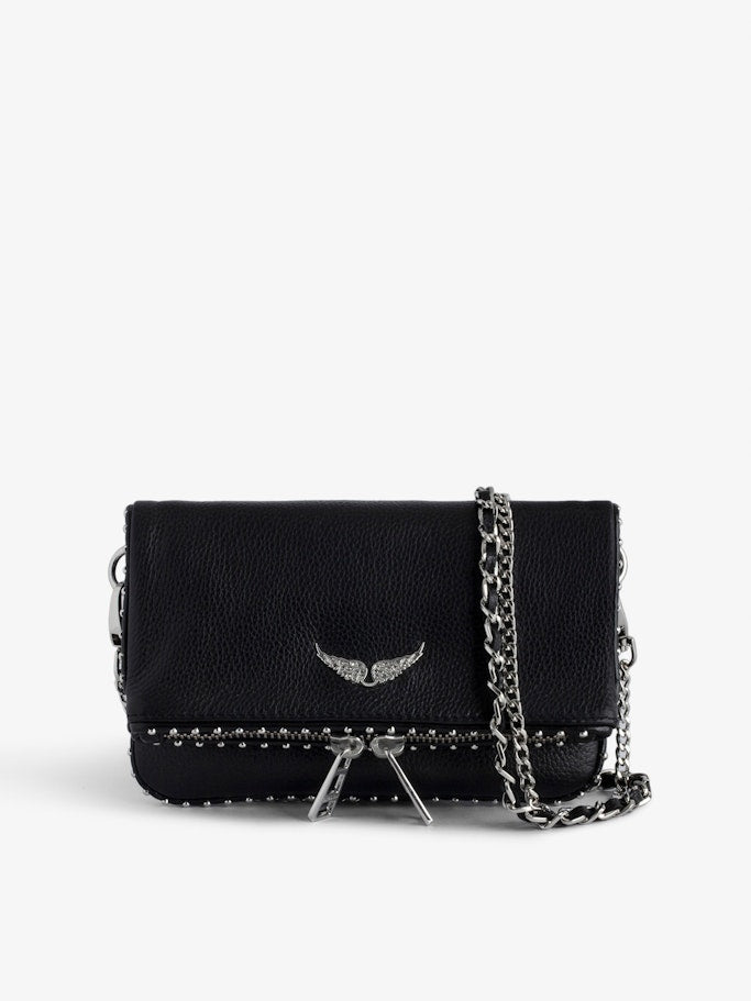 Ikonická spojka Rock Nano z černé kůže se stříbrnými cvočky.