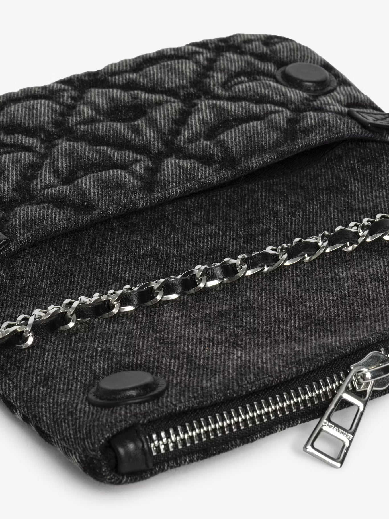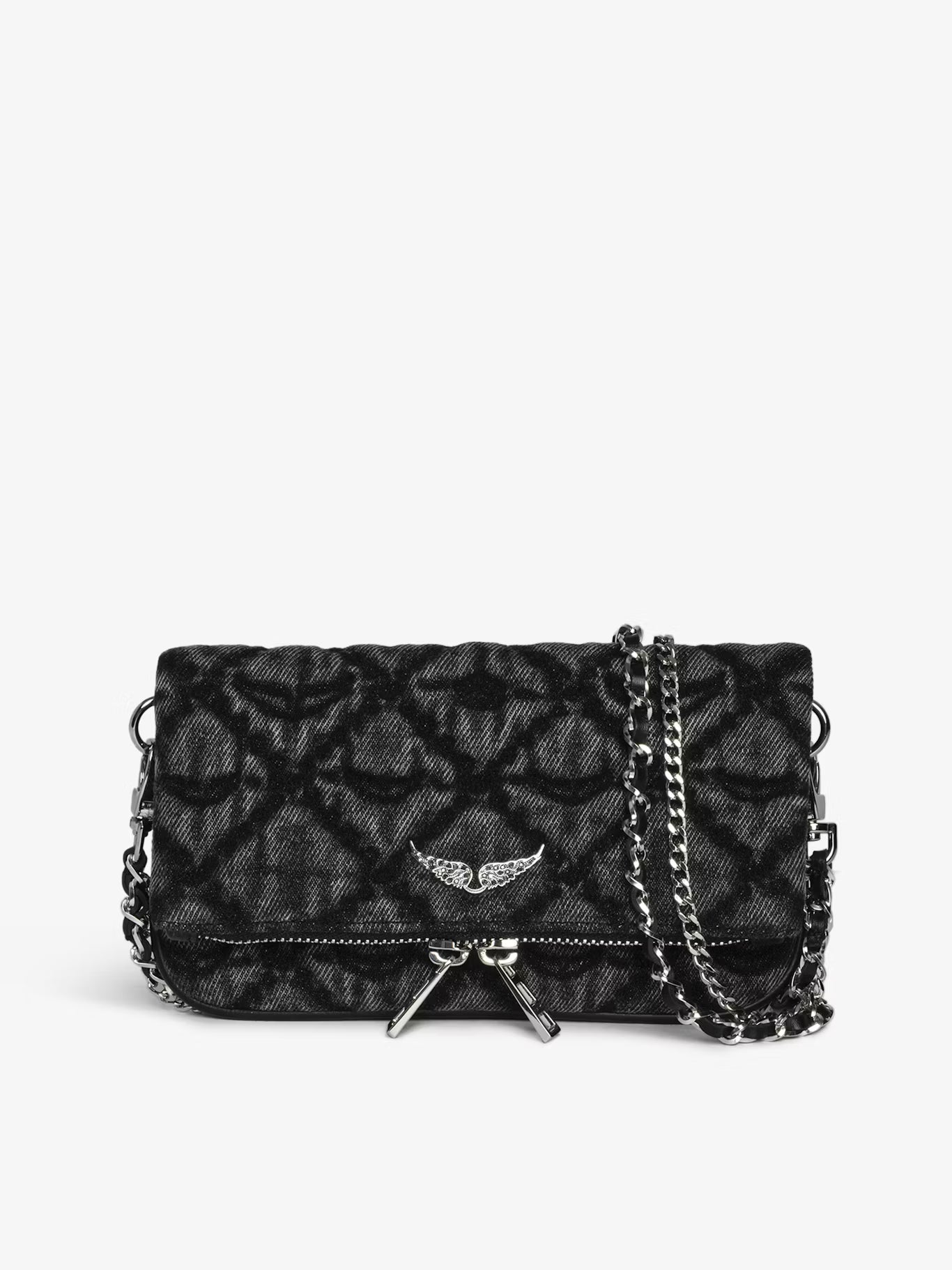 Spojka z monogramového denimu s dvojitými koženými a kovovými řetízky a křídly zdobenými kamínky.