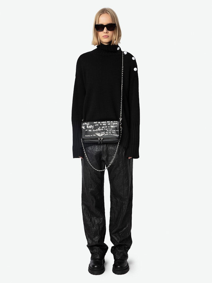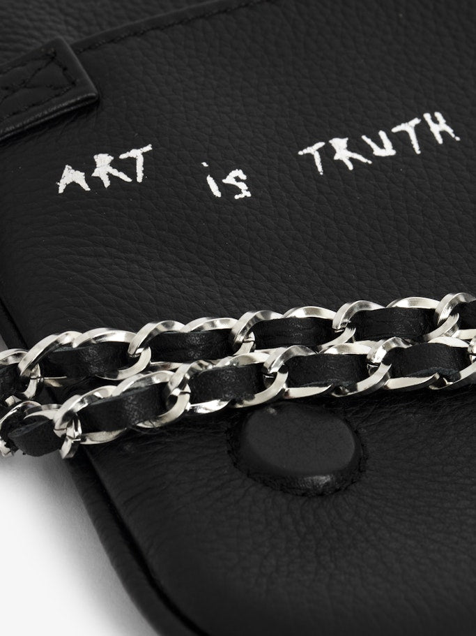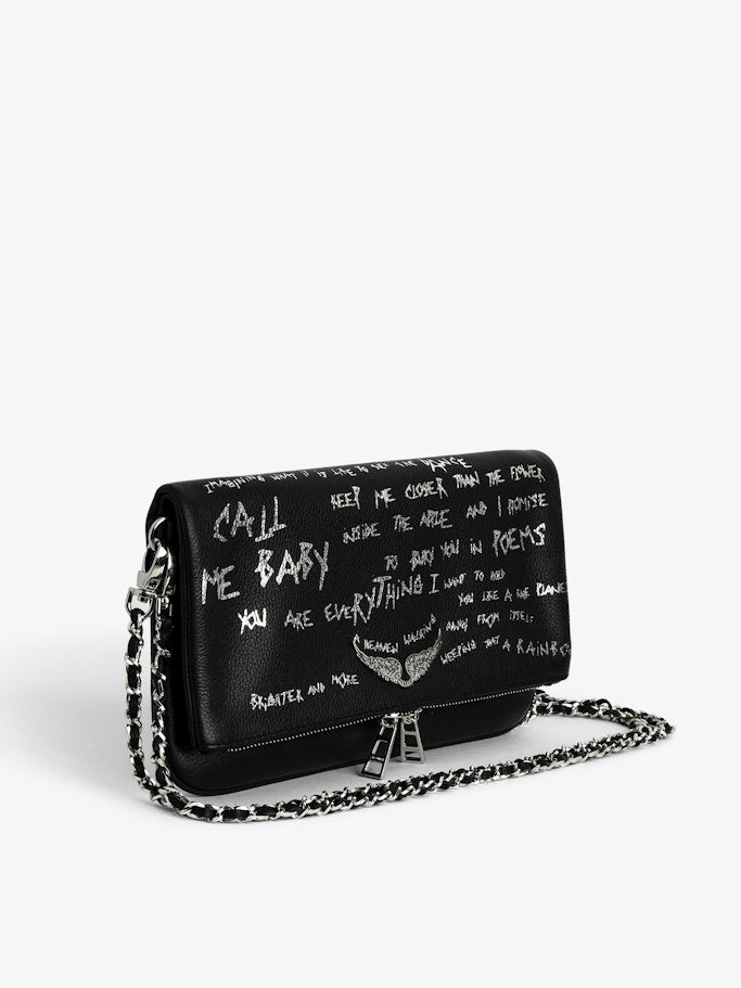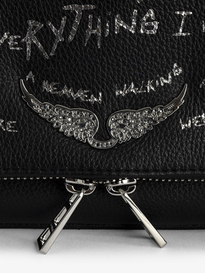 Kožená kabelka s potiskem graffiti, dvojitým řetízkem z kůže a kovu a křidélky zdobenými kamínky.