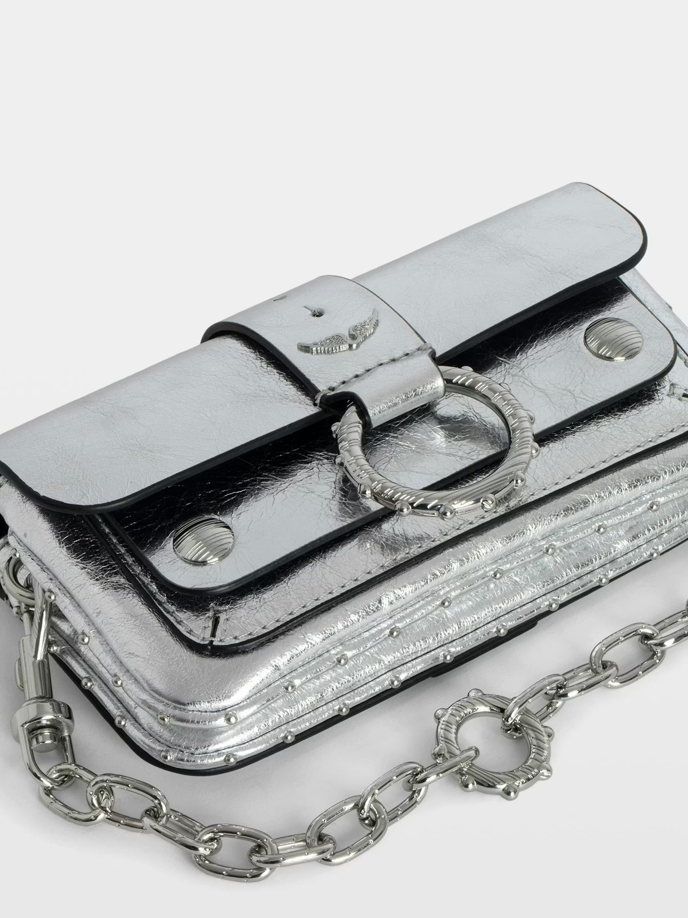 Mini kabelka z kovové kůže stříbrné barvy s kroužkem a řetízkem.