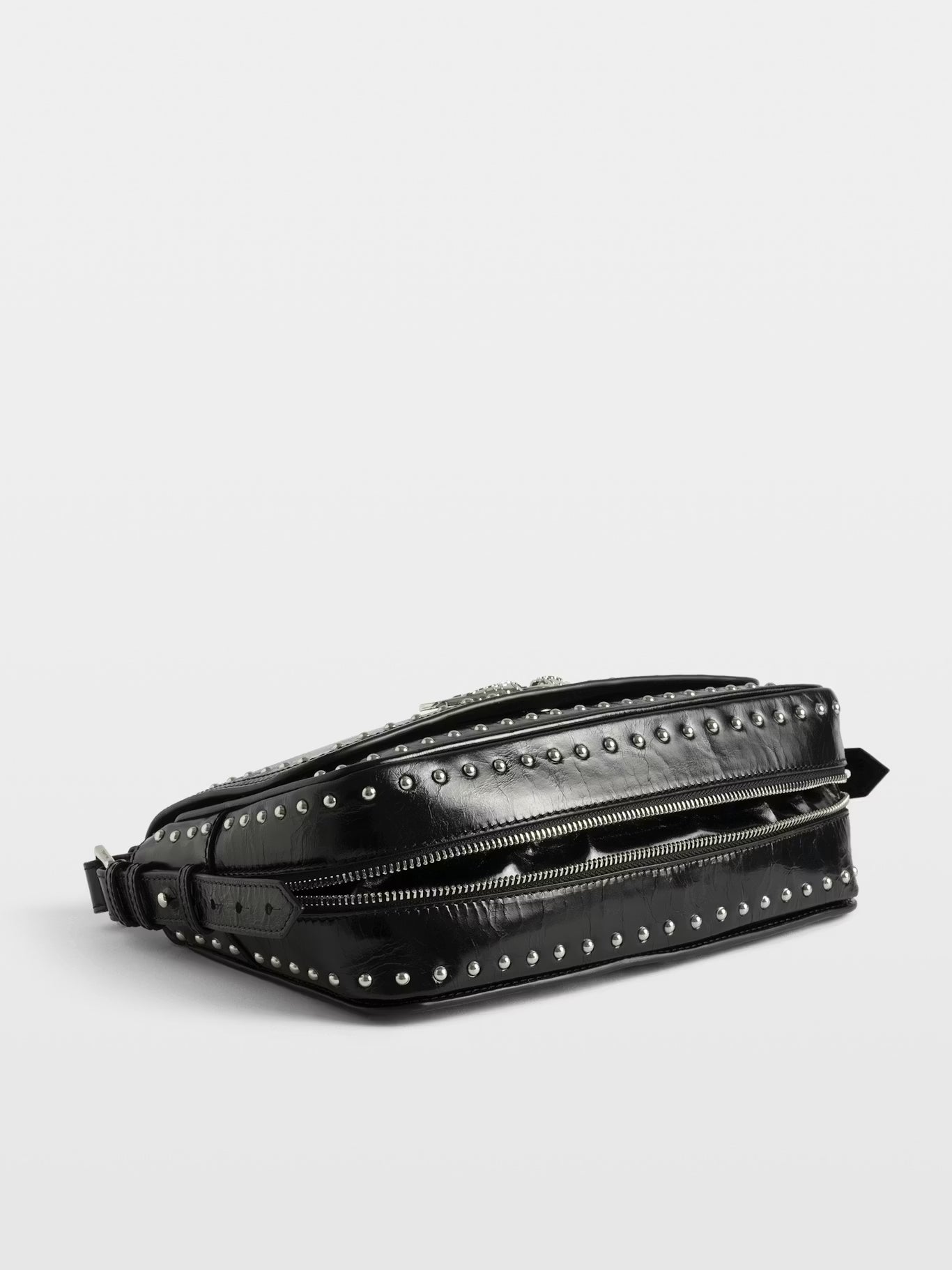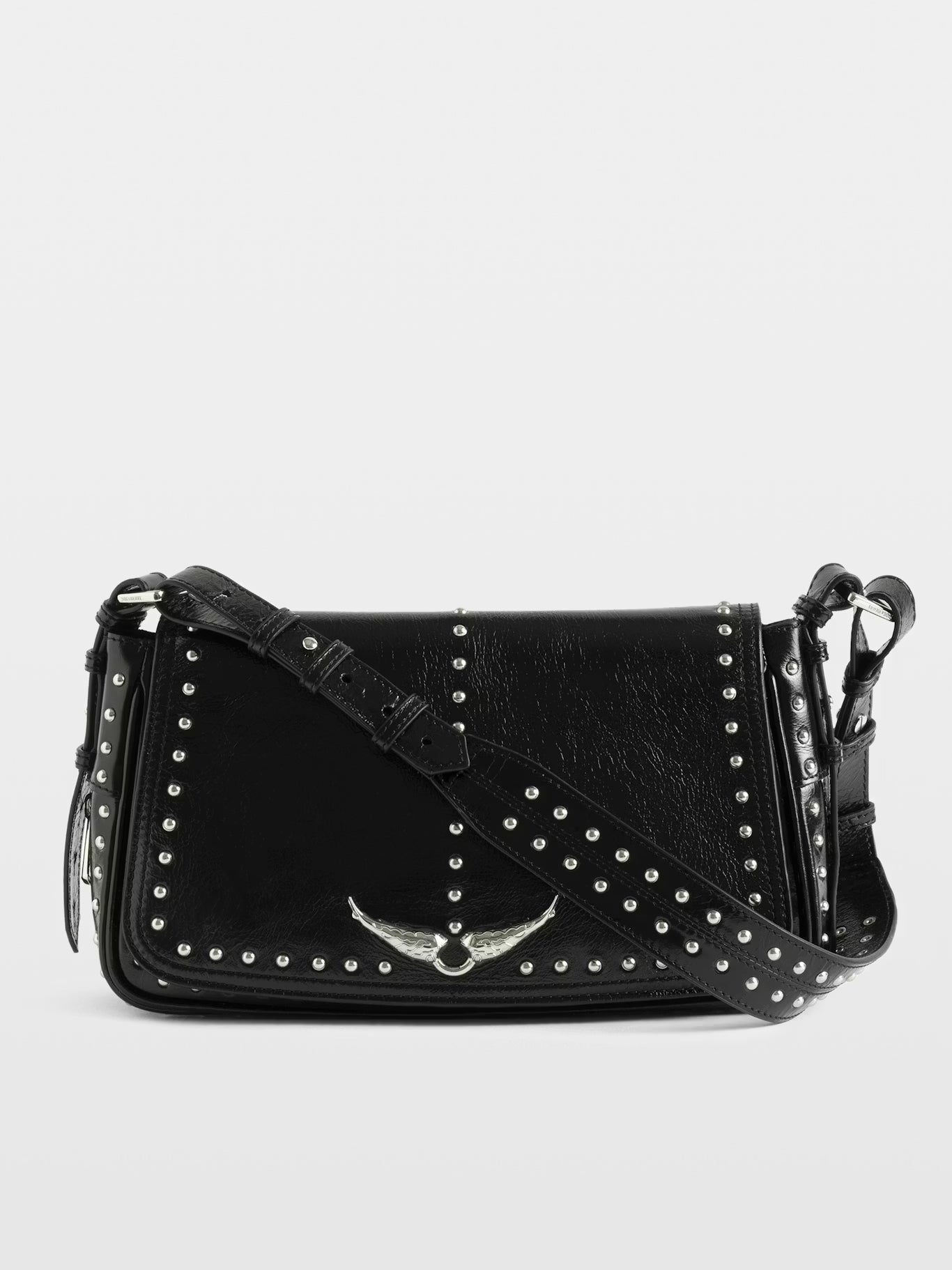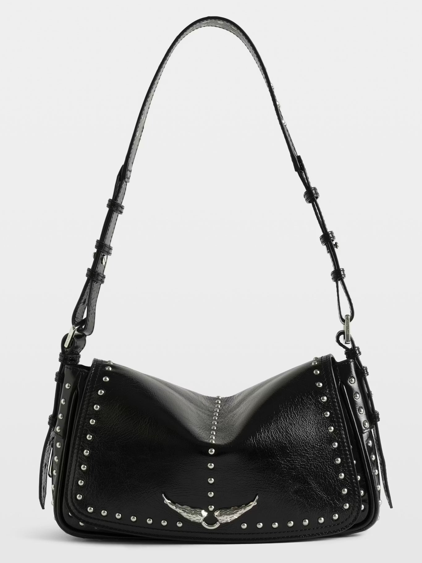 Malá lakovaná kožená kabelka ve vintage stylu zdobená cvočky, s nastavitelným ramenním popruhem a charakteristickými křidélky.