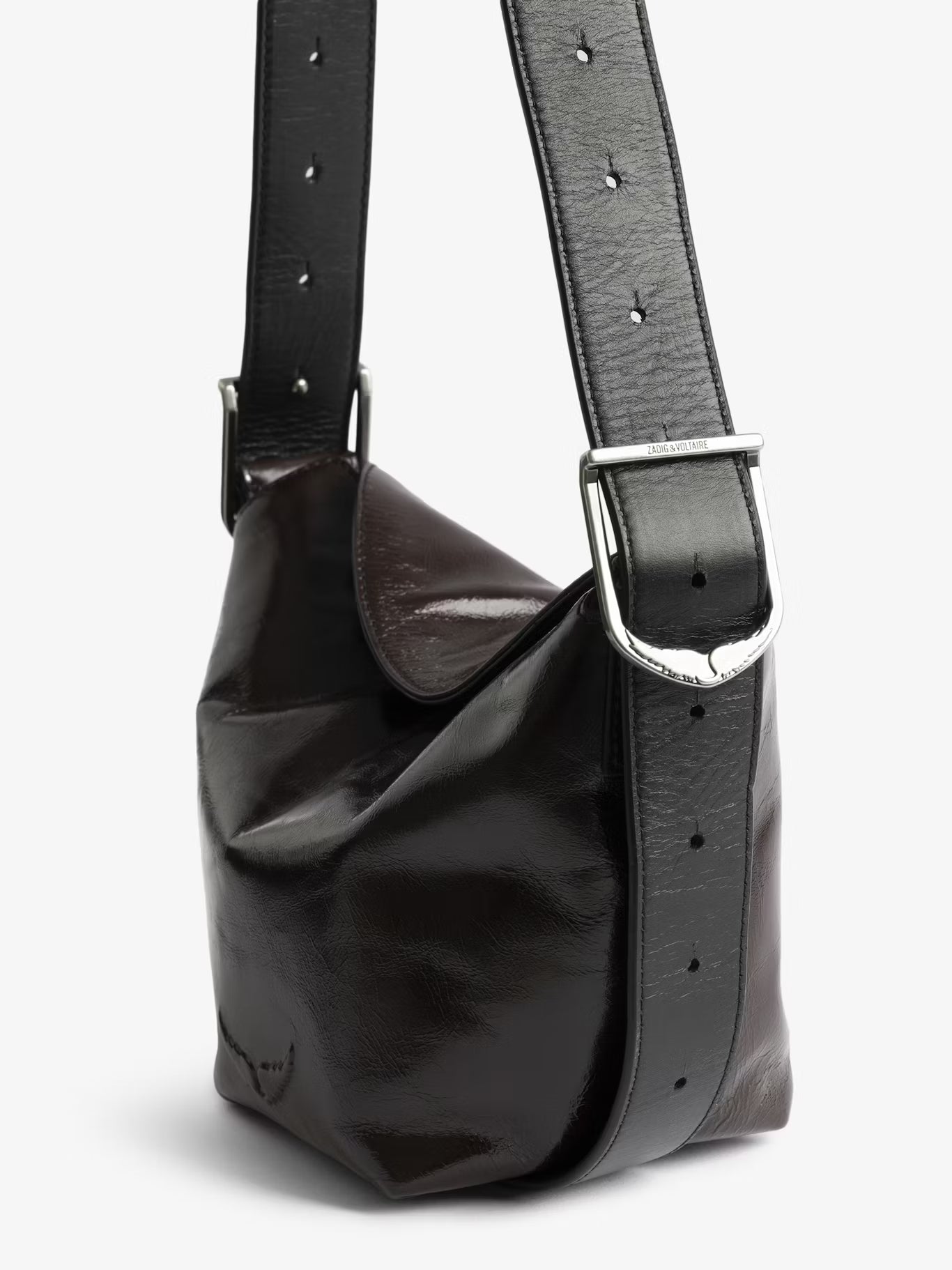 Kabelka z lakované kůže s vintage efektem, nastavitelným ramenním popruhem a reliéfním logem s křídly.