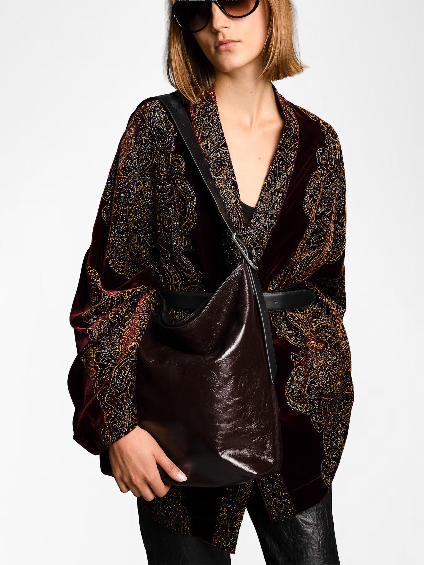 Kabelka hobo z lakované kůže s vintage efektem, s nastavitelnou rukojetí a reliéfním logem s křídly.
