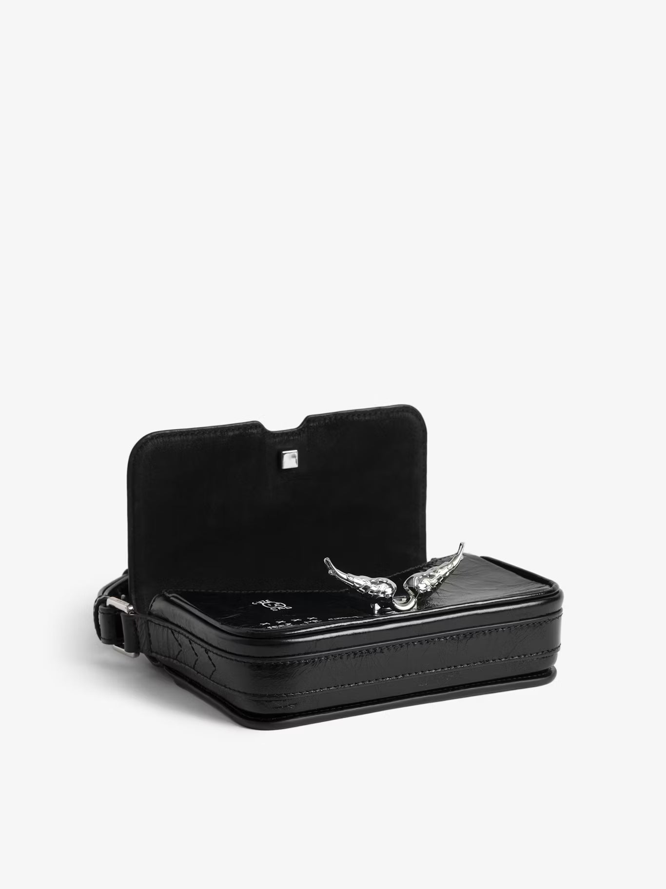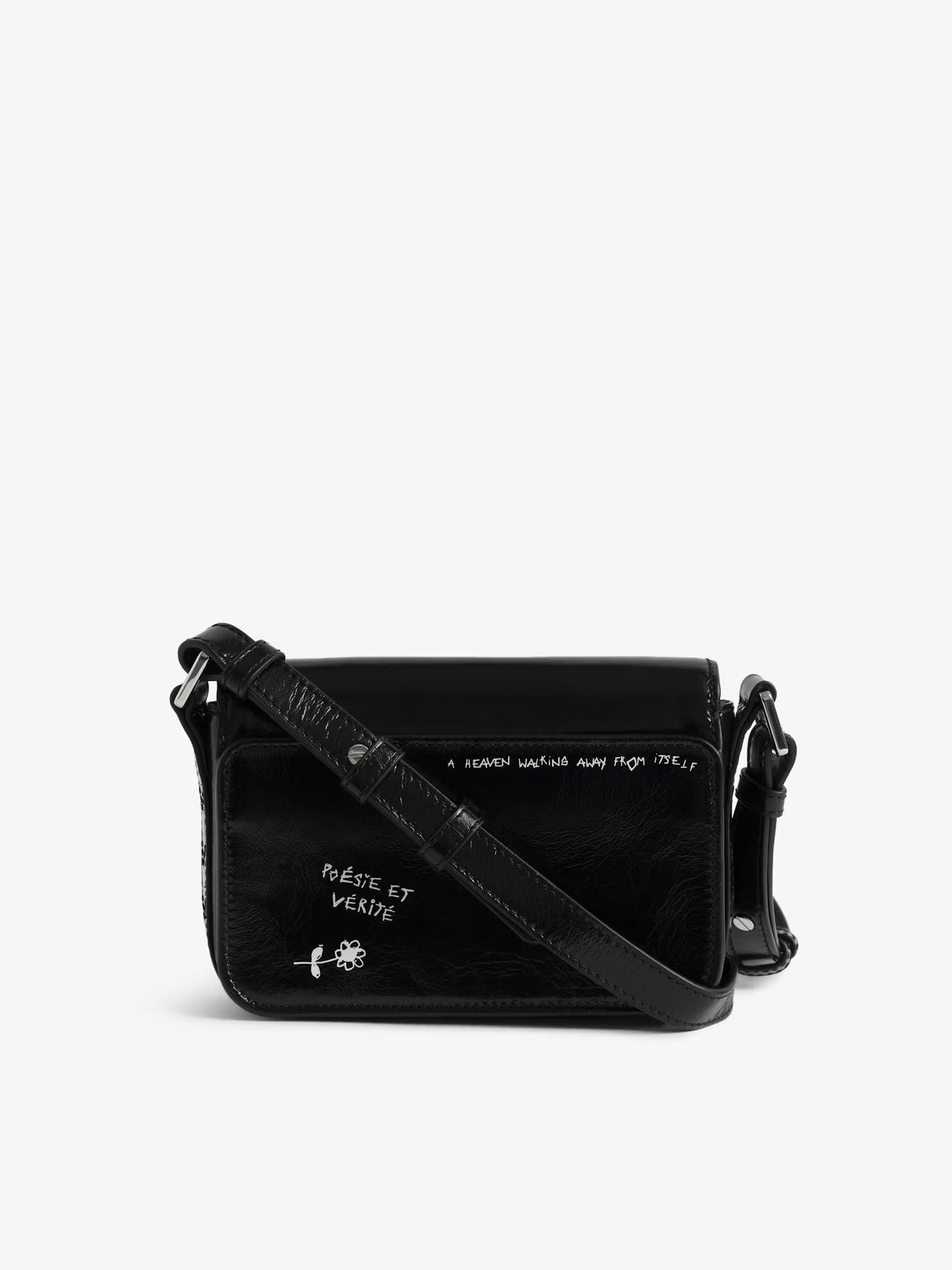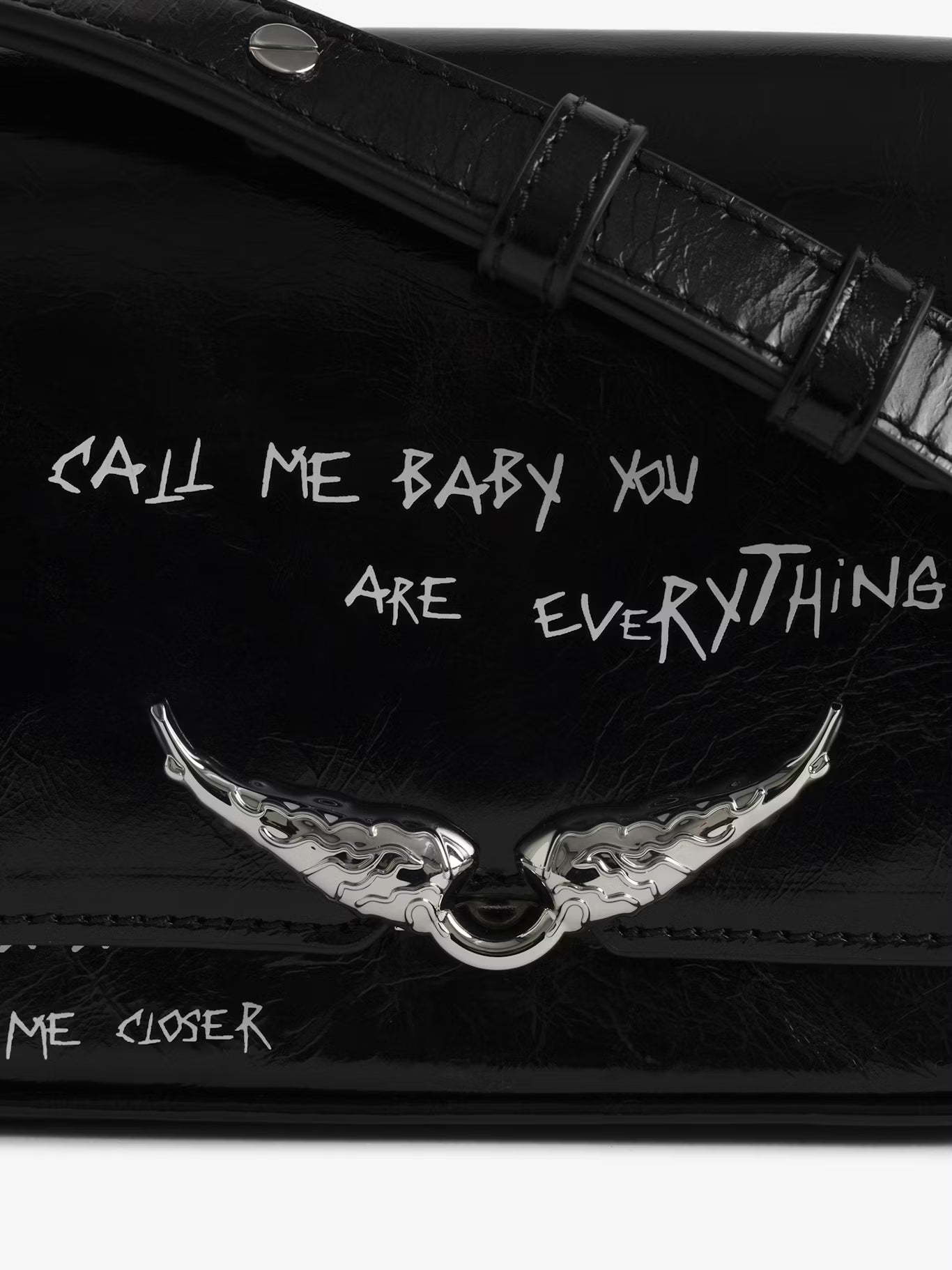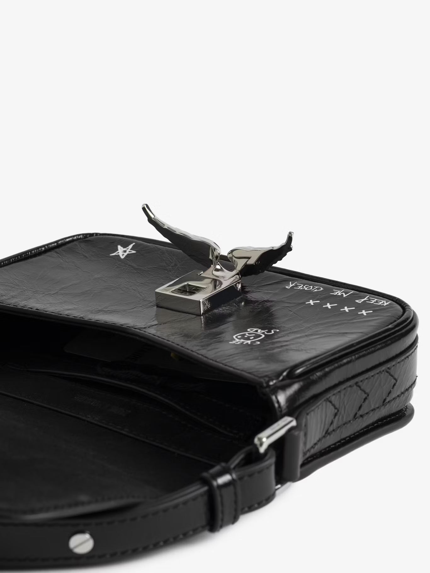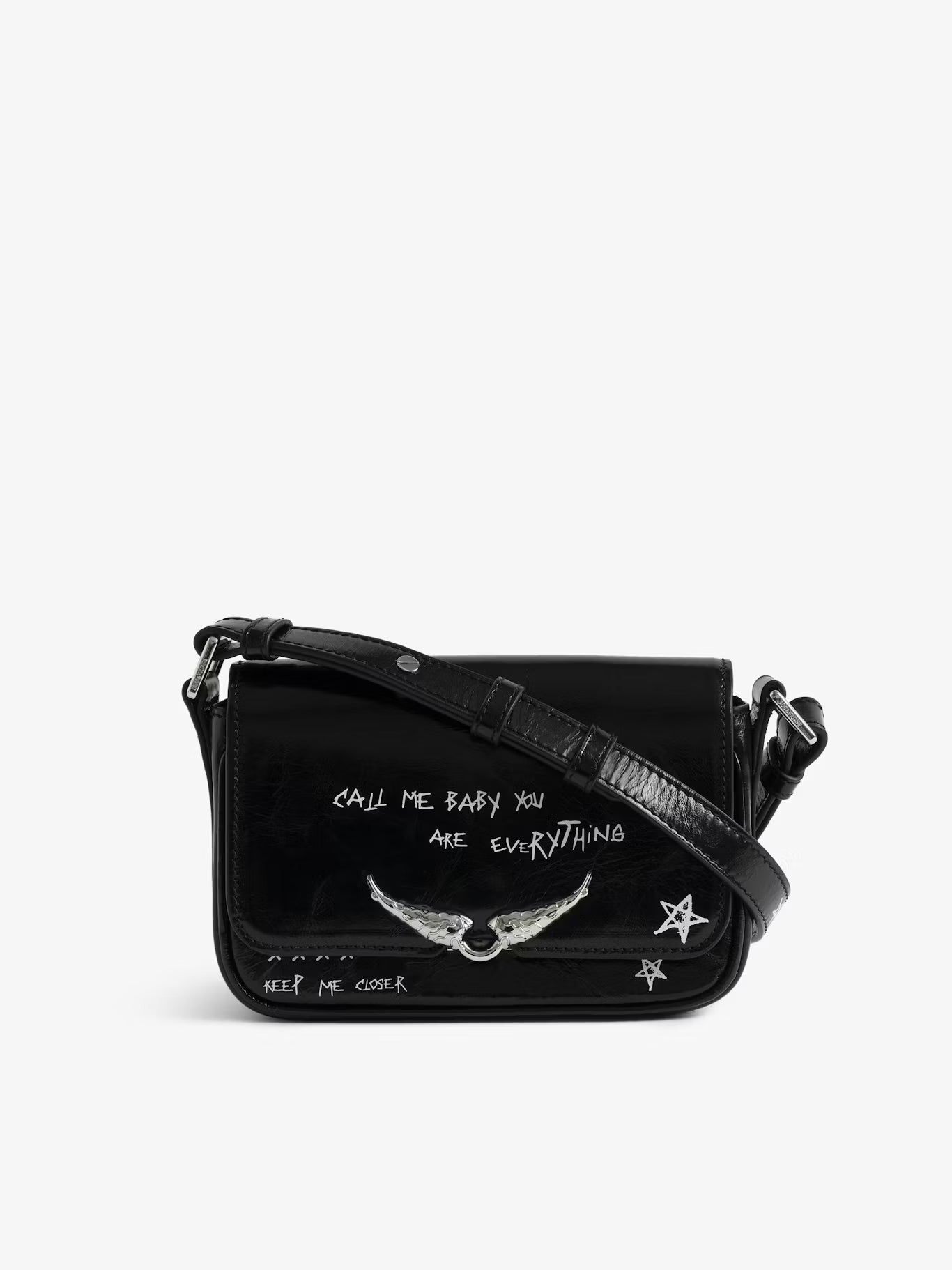 Malá lakovaná kožená kabelka s vintage efektem a graffiti potiskem, s nastavitelným popruhem a charakteristickými křidélky.