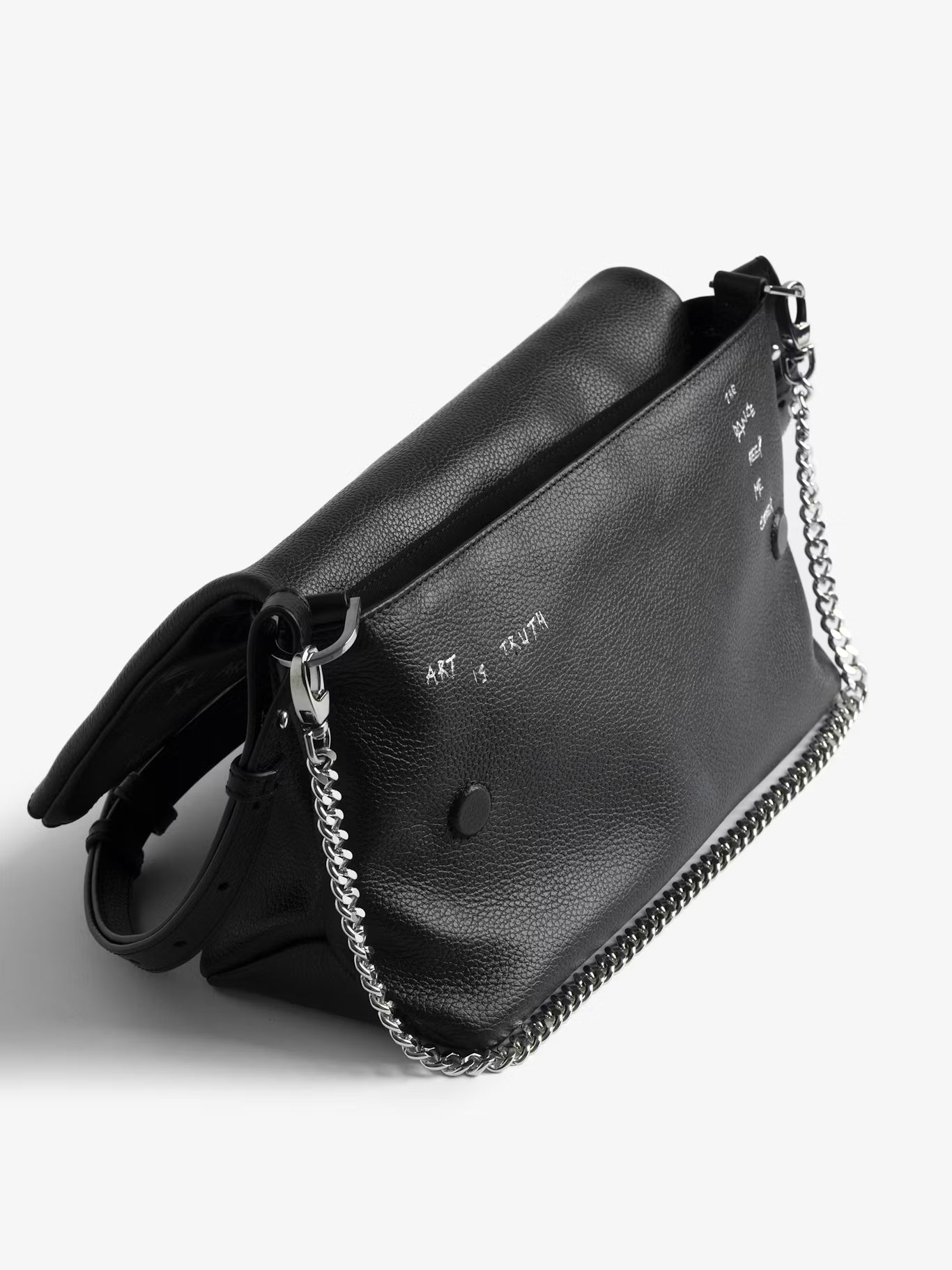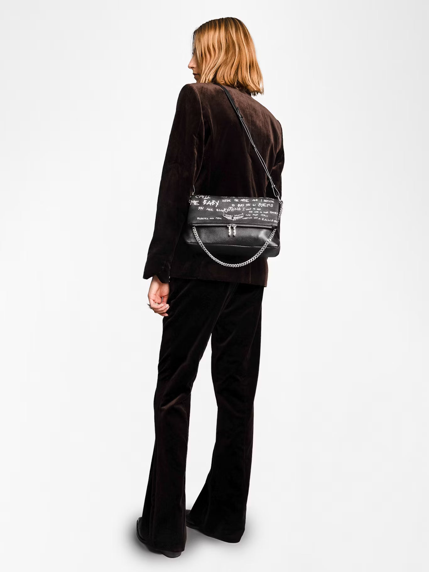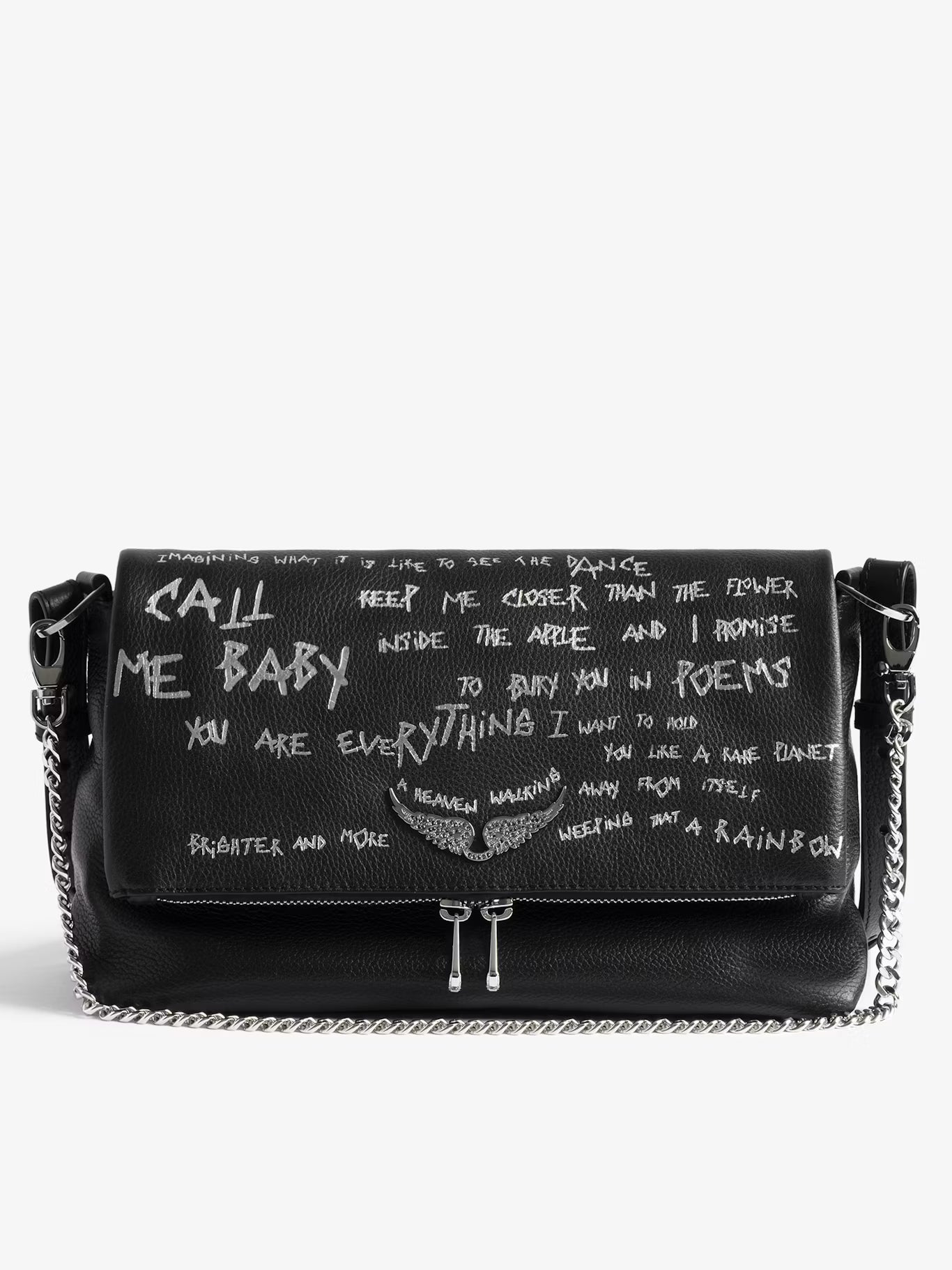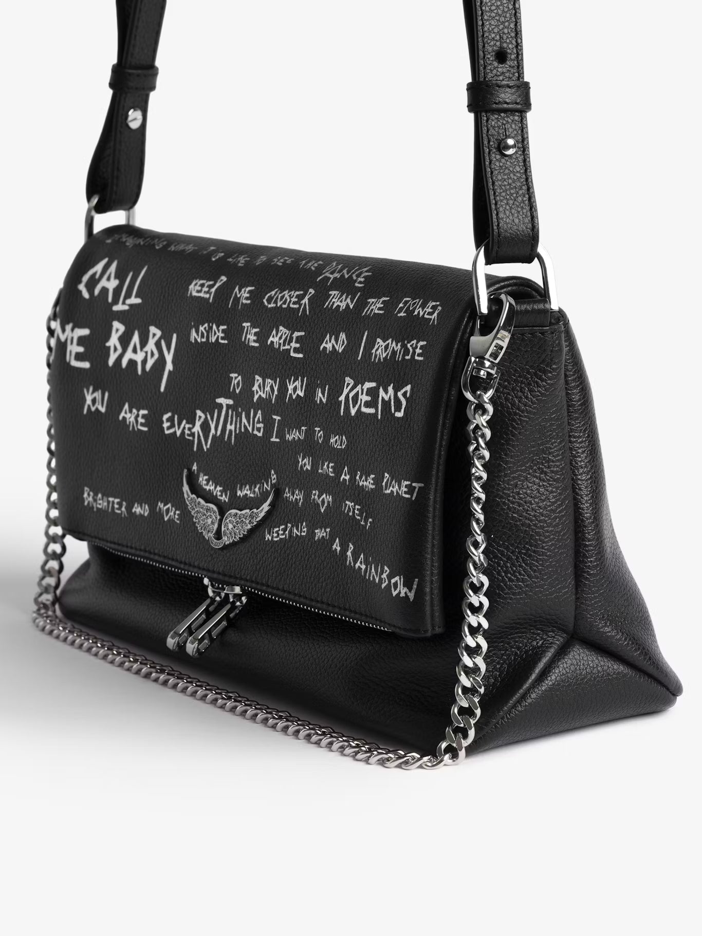 Kabelka z ryzí kůže s graffiti potiskem a ramenním popruhem, s řetízkem a charakteristickými křídly zdobenými kamínky.