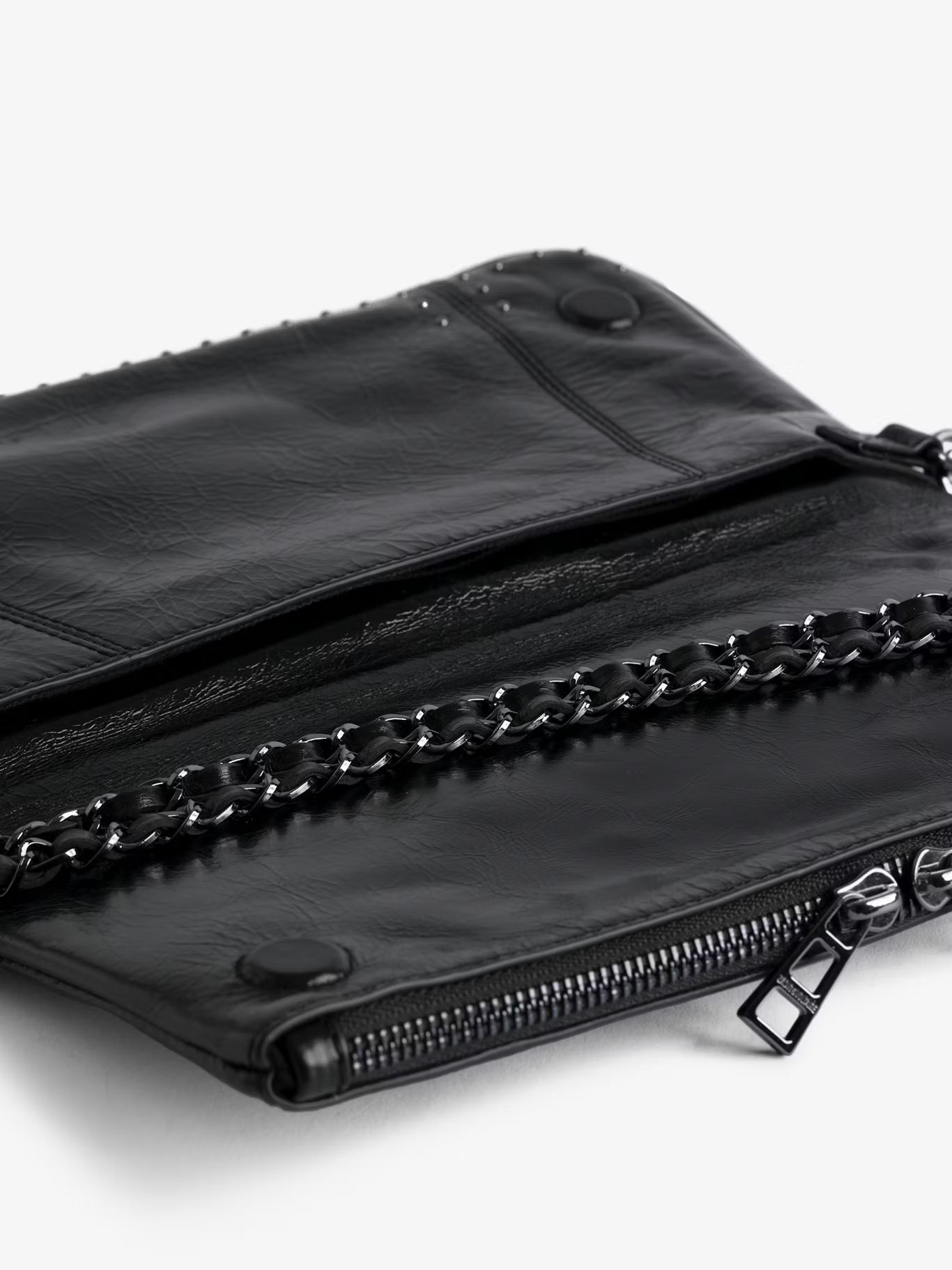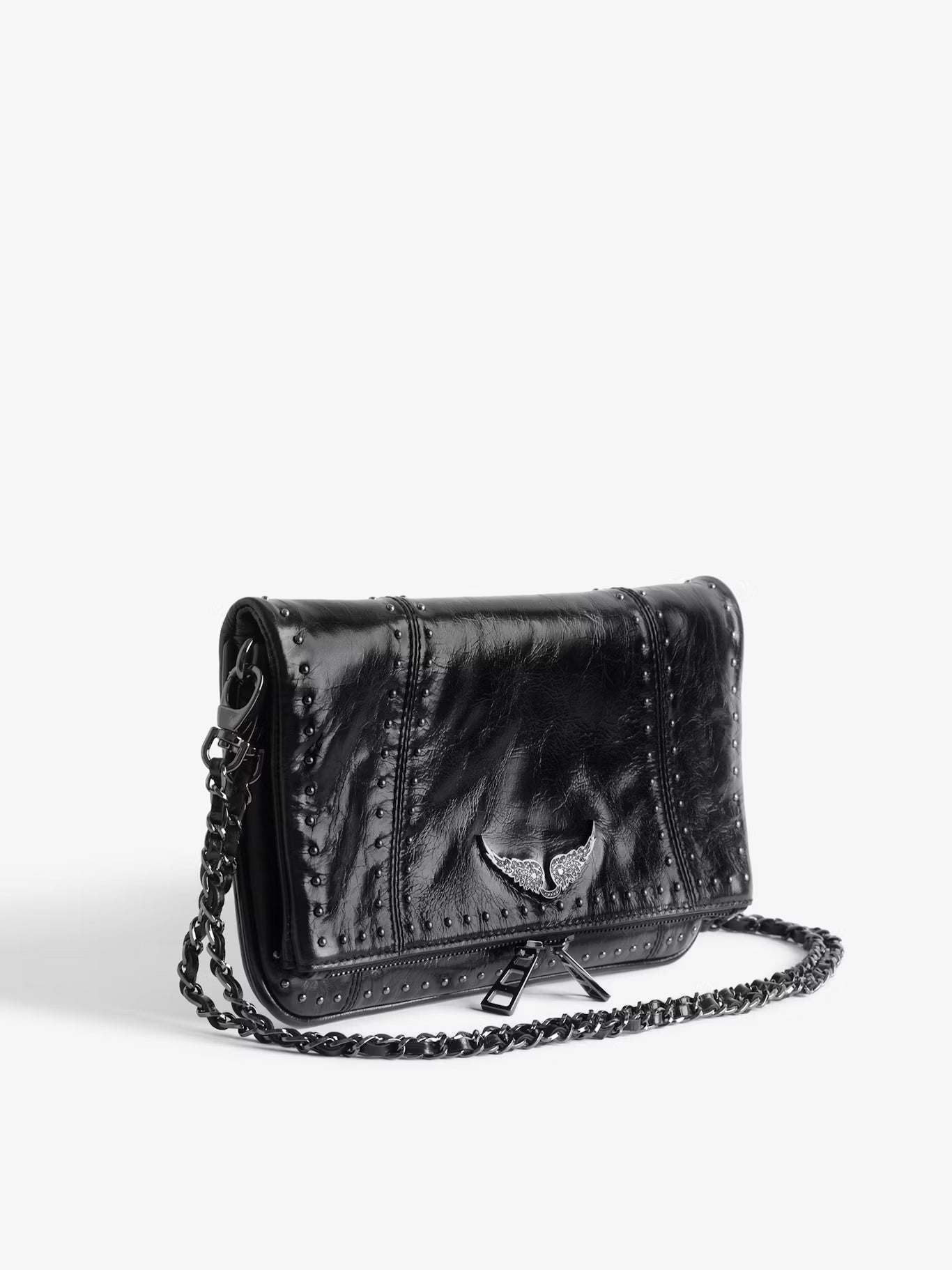 Lakovaná kožená kabelka ve vintage stylu s dvojitými koženými a kovovými řetízky zdobenými cvočky a křidélky z kamínků.