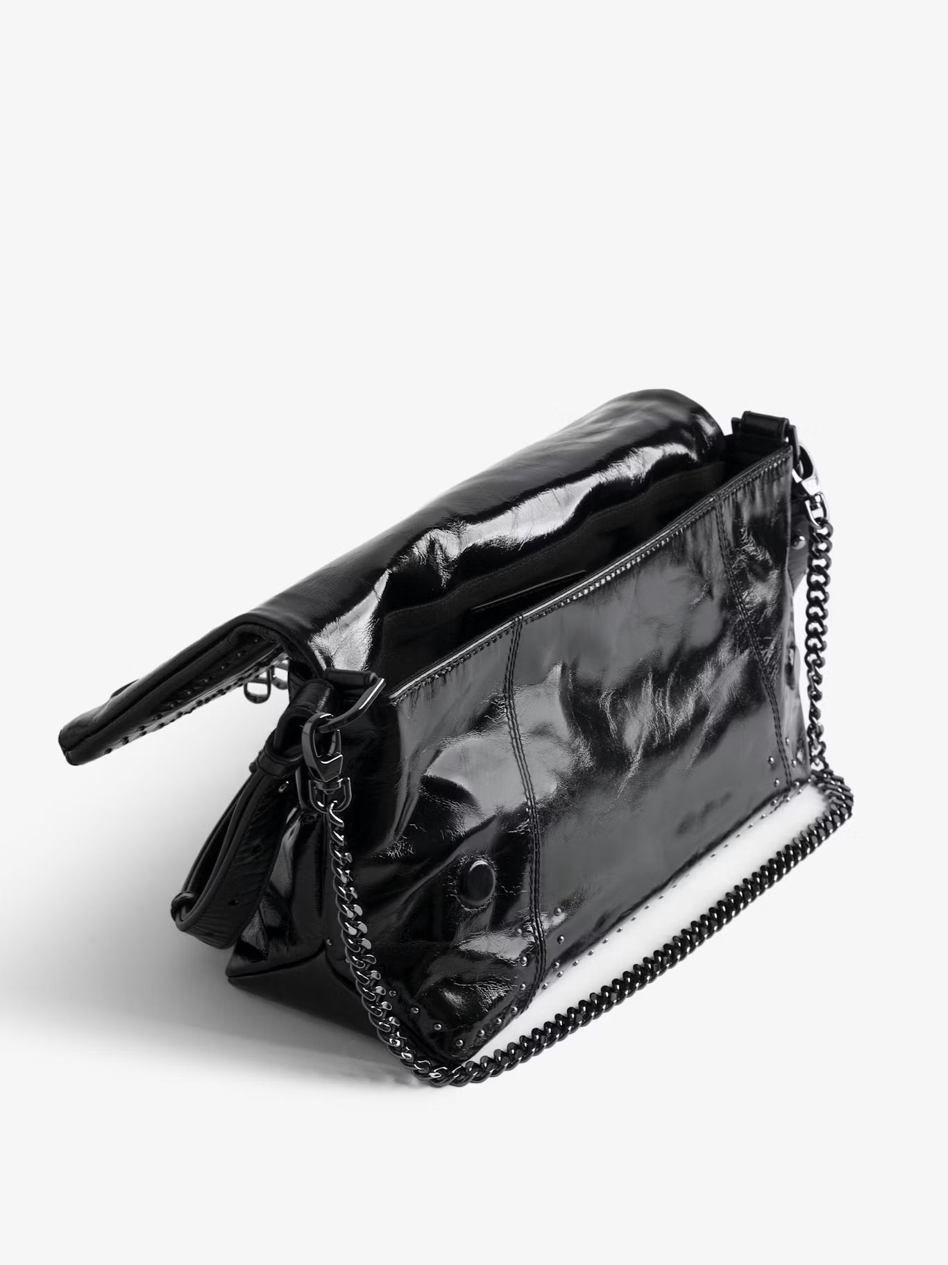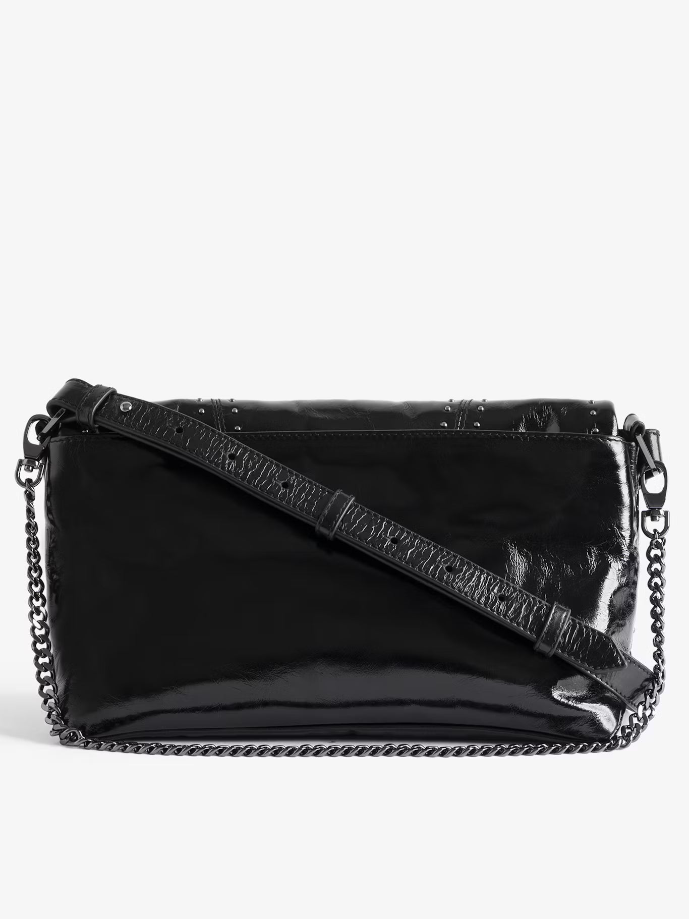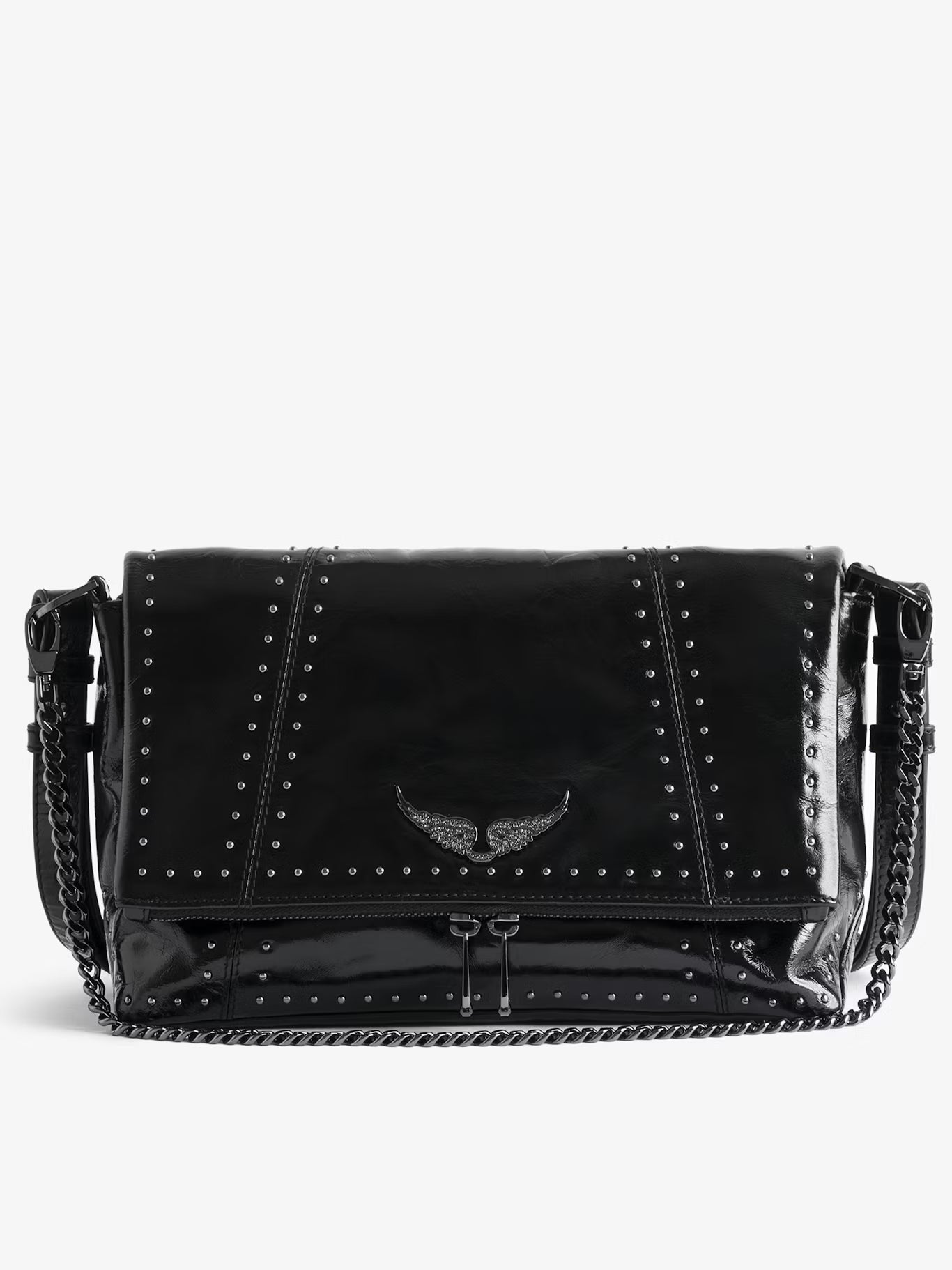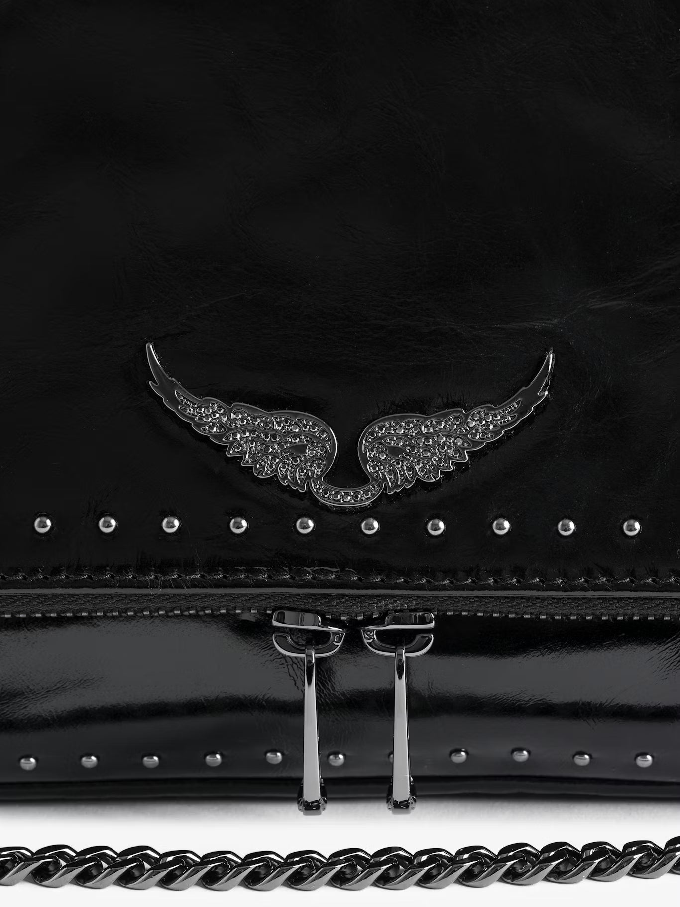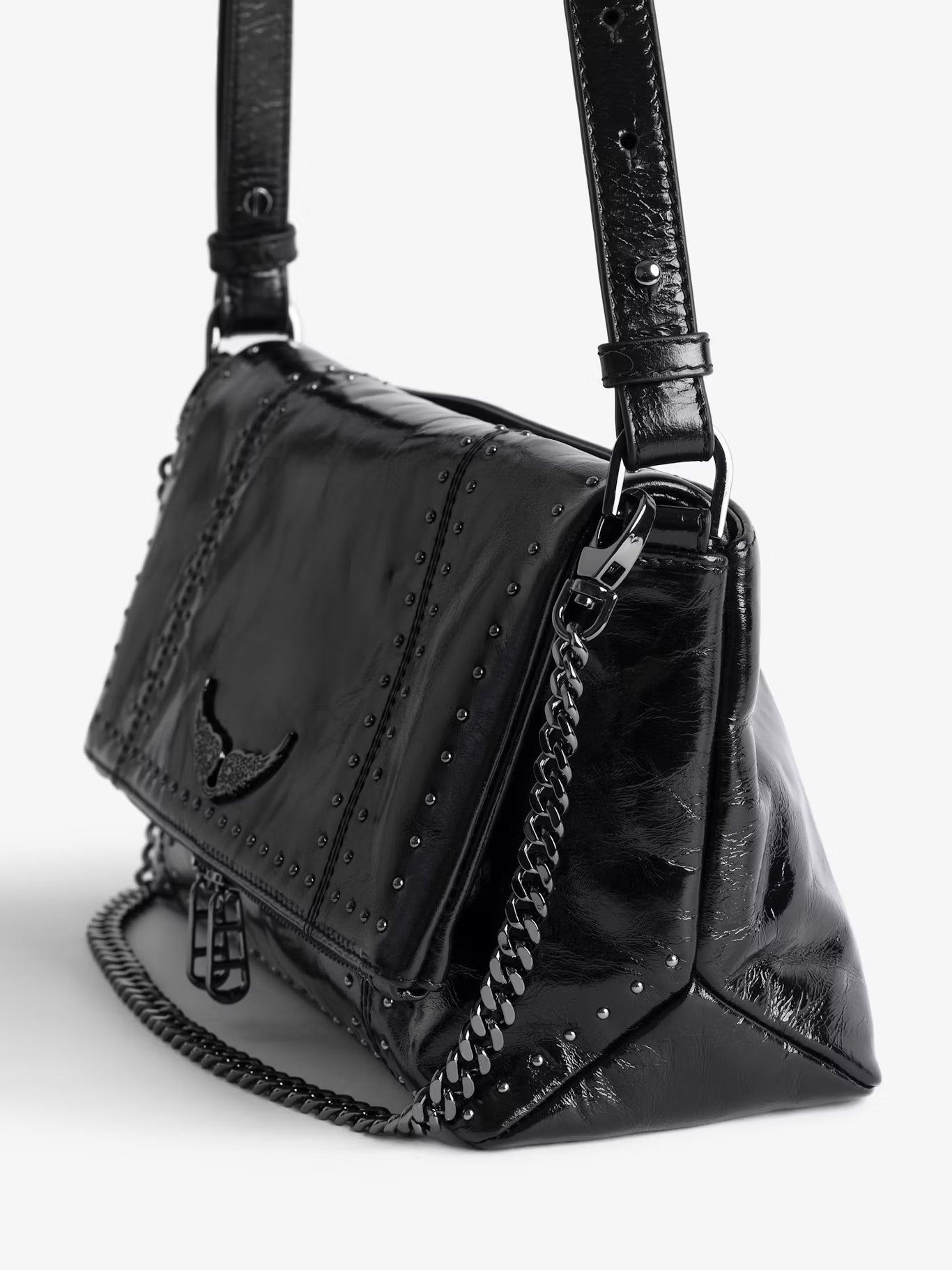 Lakovaná kožená kabelka s vintage efektem zdobená cvočky, s ramenním popruhem, řetízkem a charakteristickými křídly zdobenými kamínky.