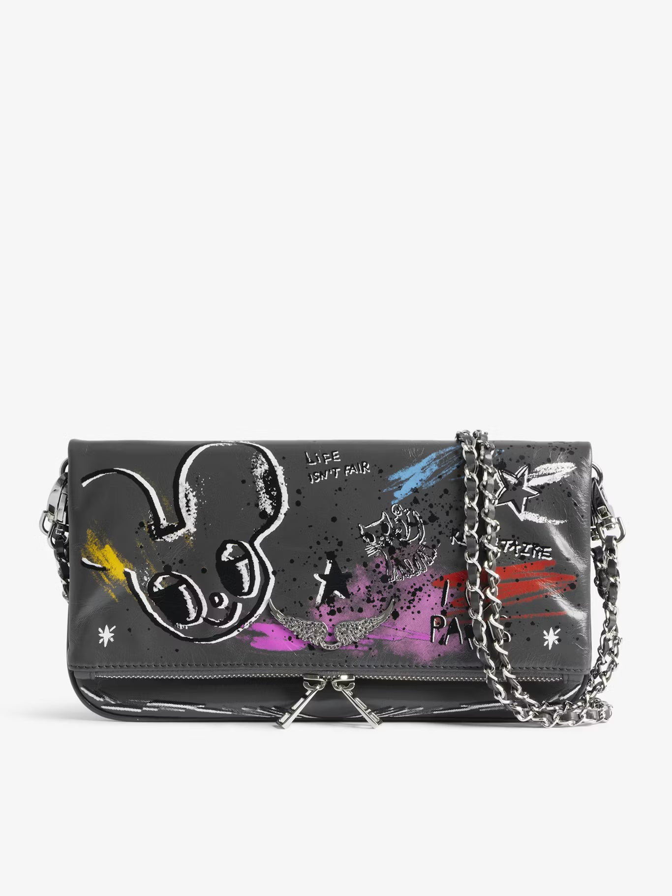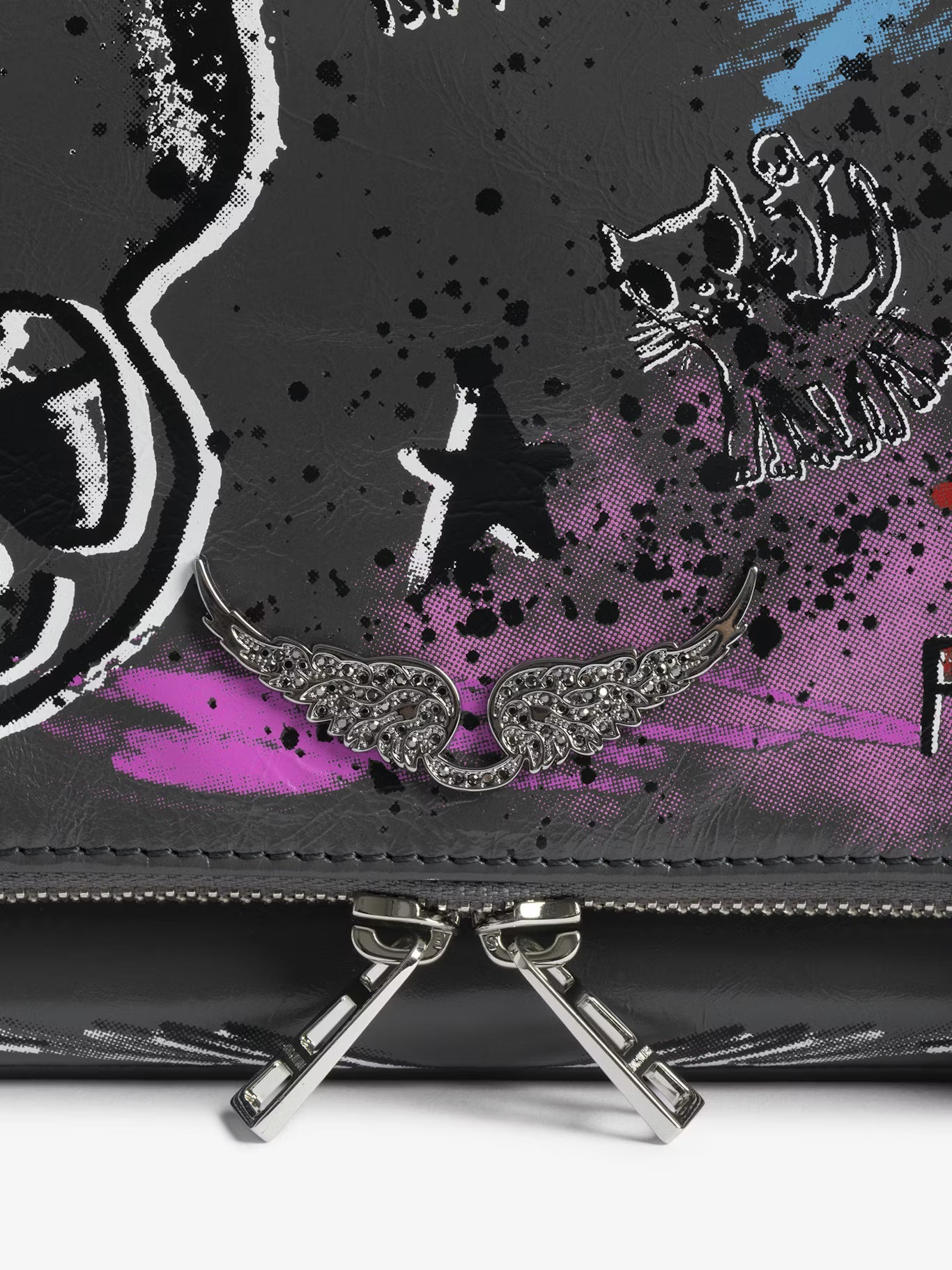 Psaníčko z zrněné kůže s personalizací od Humberta Cruze, s dvojitým popruhem z kůže a kovu a křídly zdobenými kamínky.