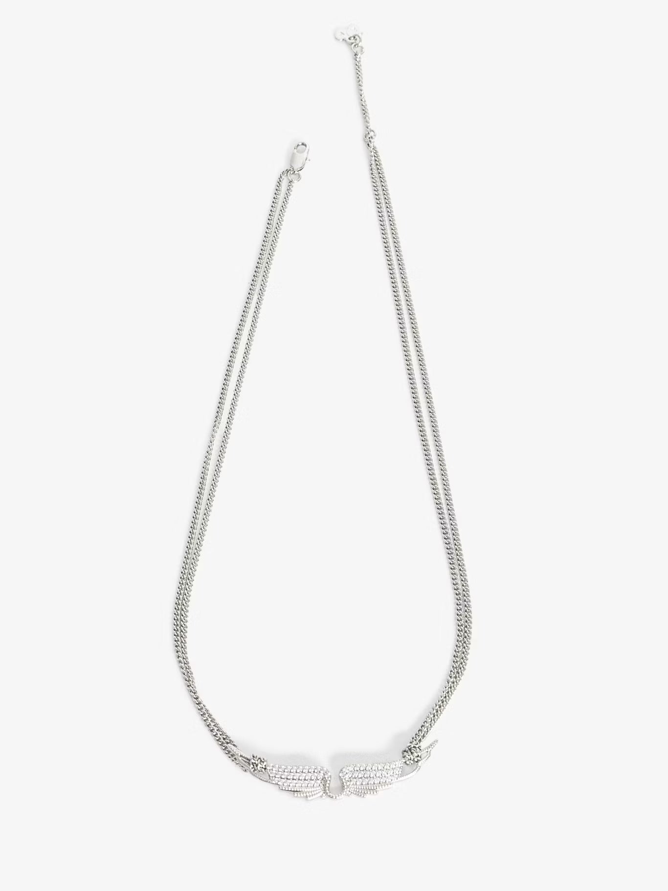 Náhrdelník s dvojitým řetízkem a přívěskem ve tvaru křídla zdobený kamínky.