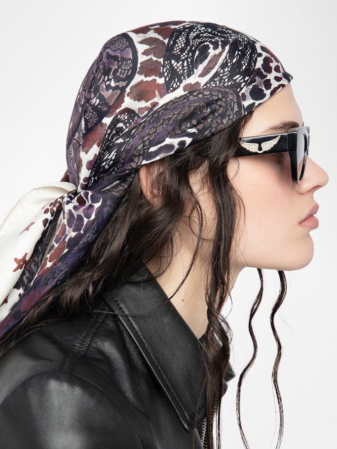 Hranatý šátek ze směsi hedvábí s potiskem hada.
