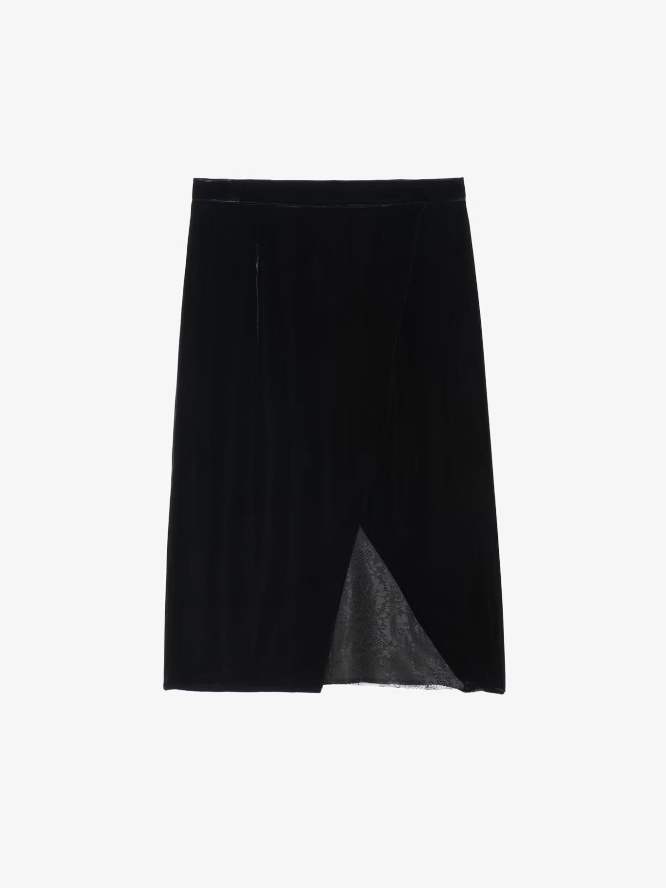 Středně dlouhá sametová sukně inspirovaná spodním prádlem s krajkou a zavinovacím střihem.
