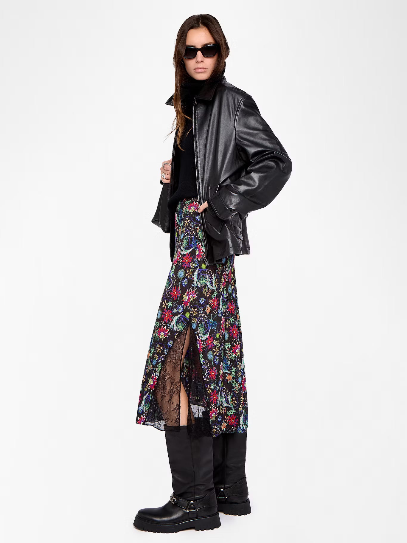 Středně dlouhá sukně ve stylu spodního prádla z potištěné viskózy s krajkou.