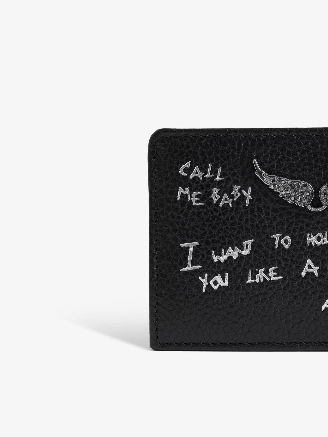 Pouzdro na karty z kůže s texturou zdobené křidélky z kamínků. Potisk graffiti.
