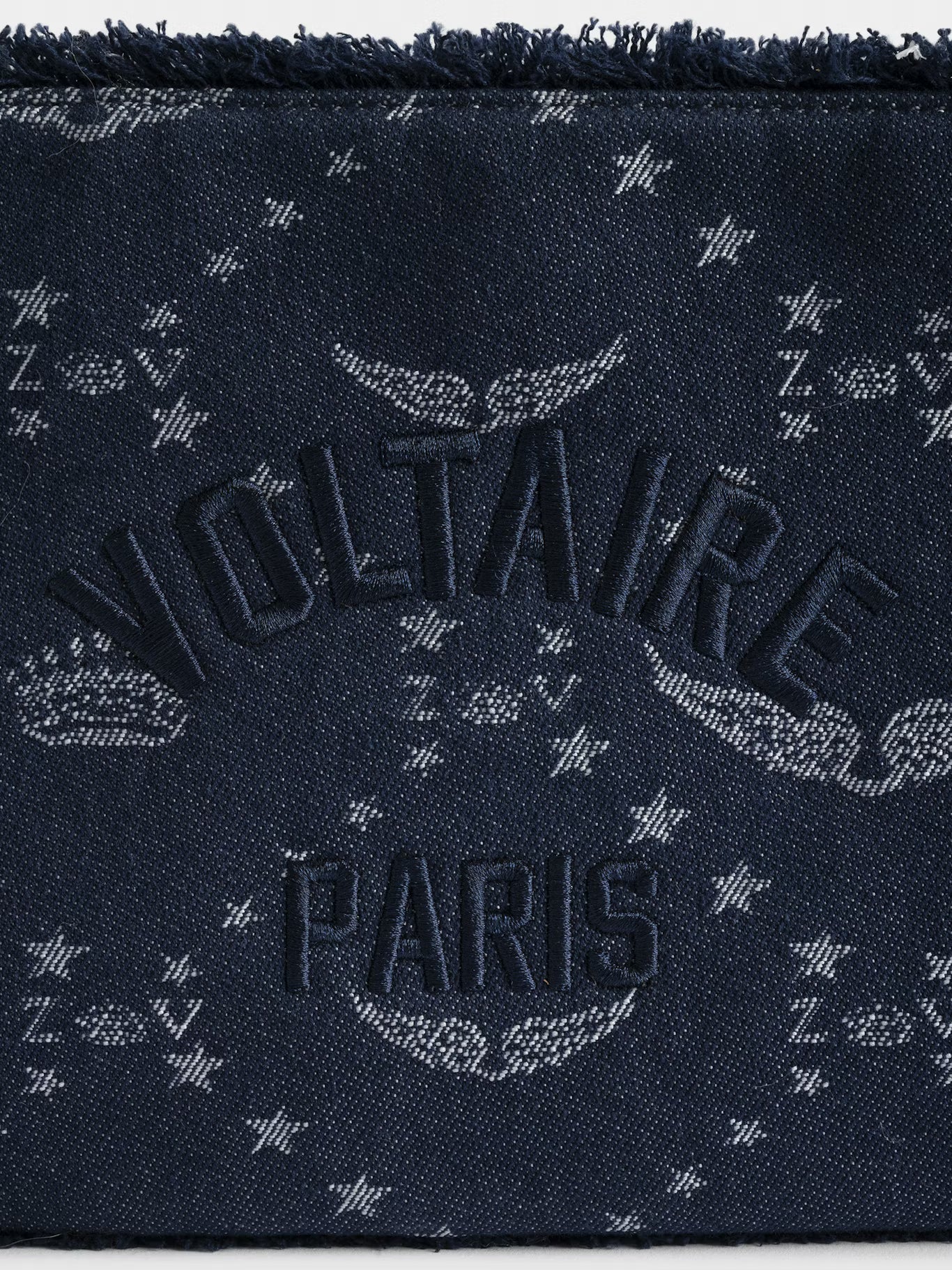 Džínová psaníčka s monogramem a charakteristickými křidélky.
