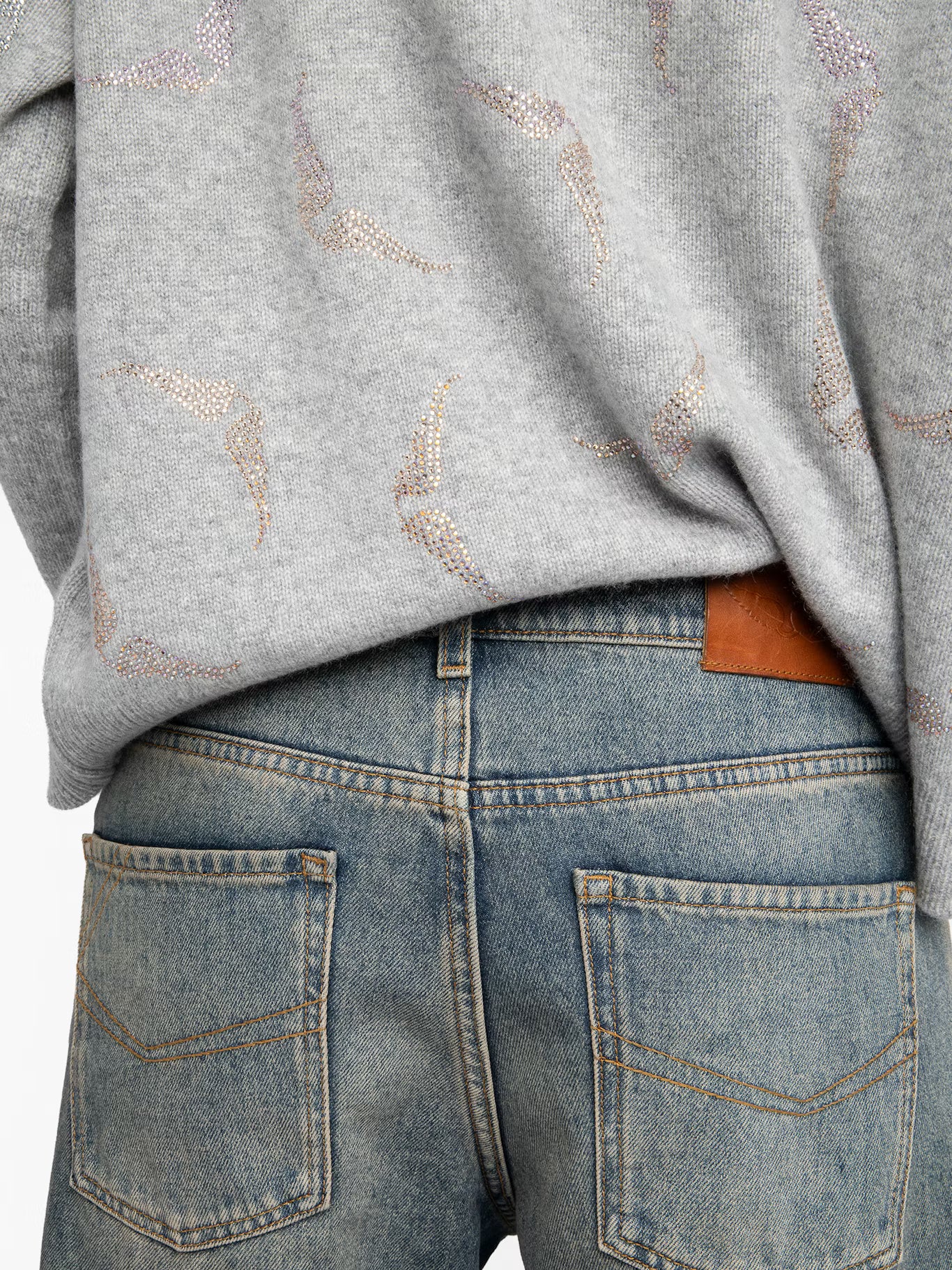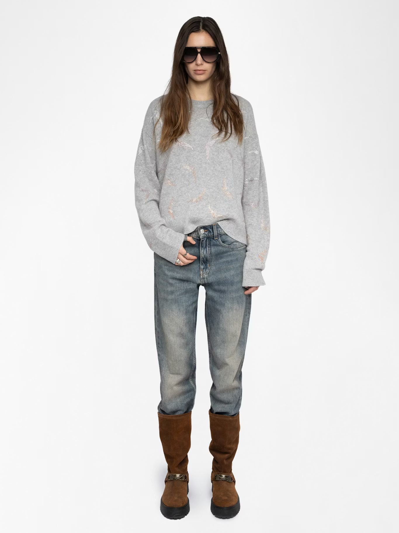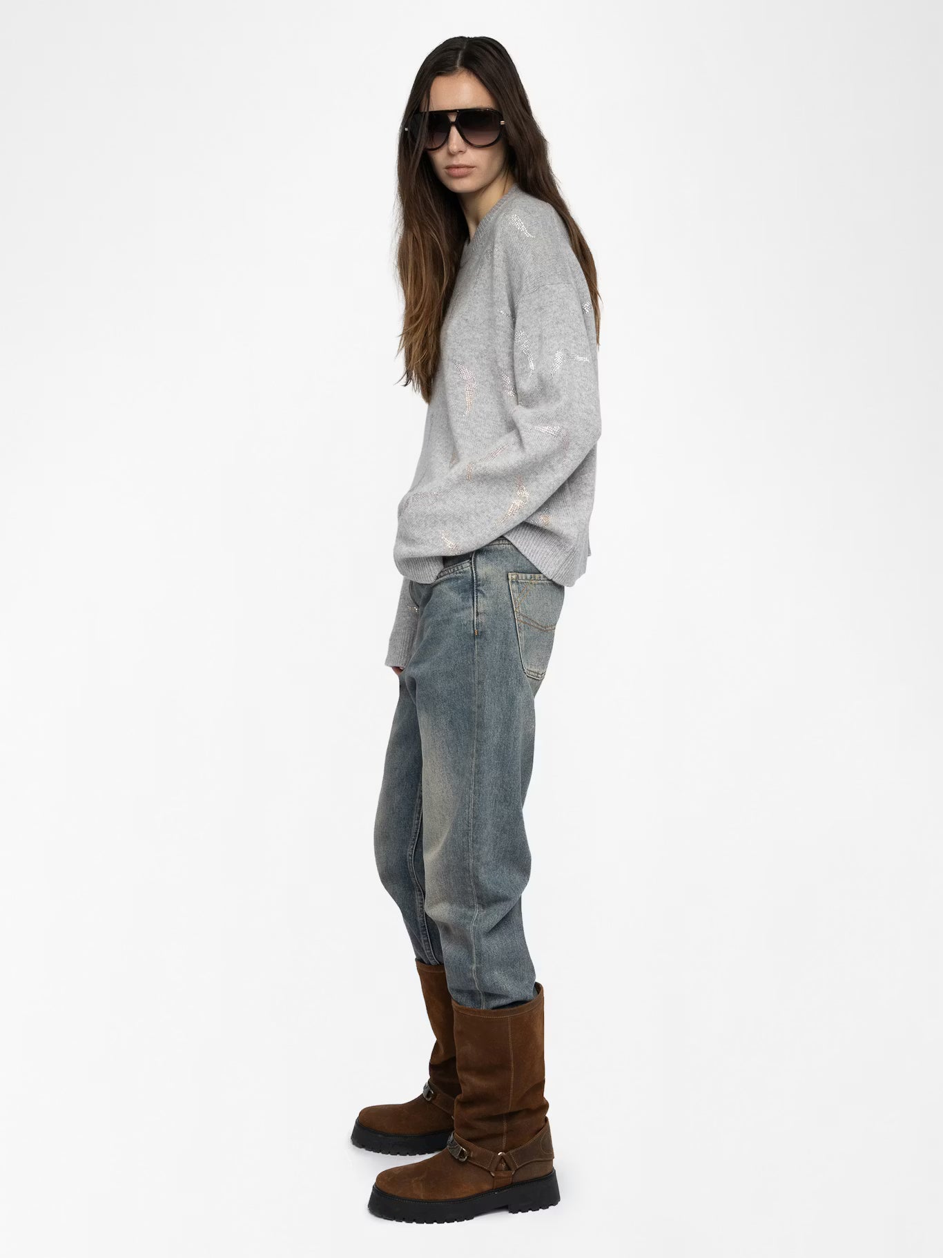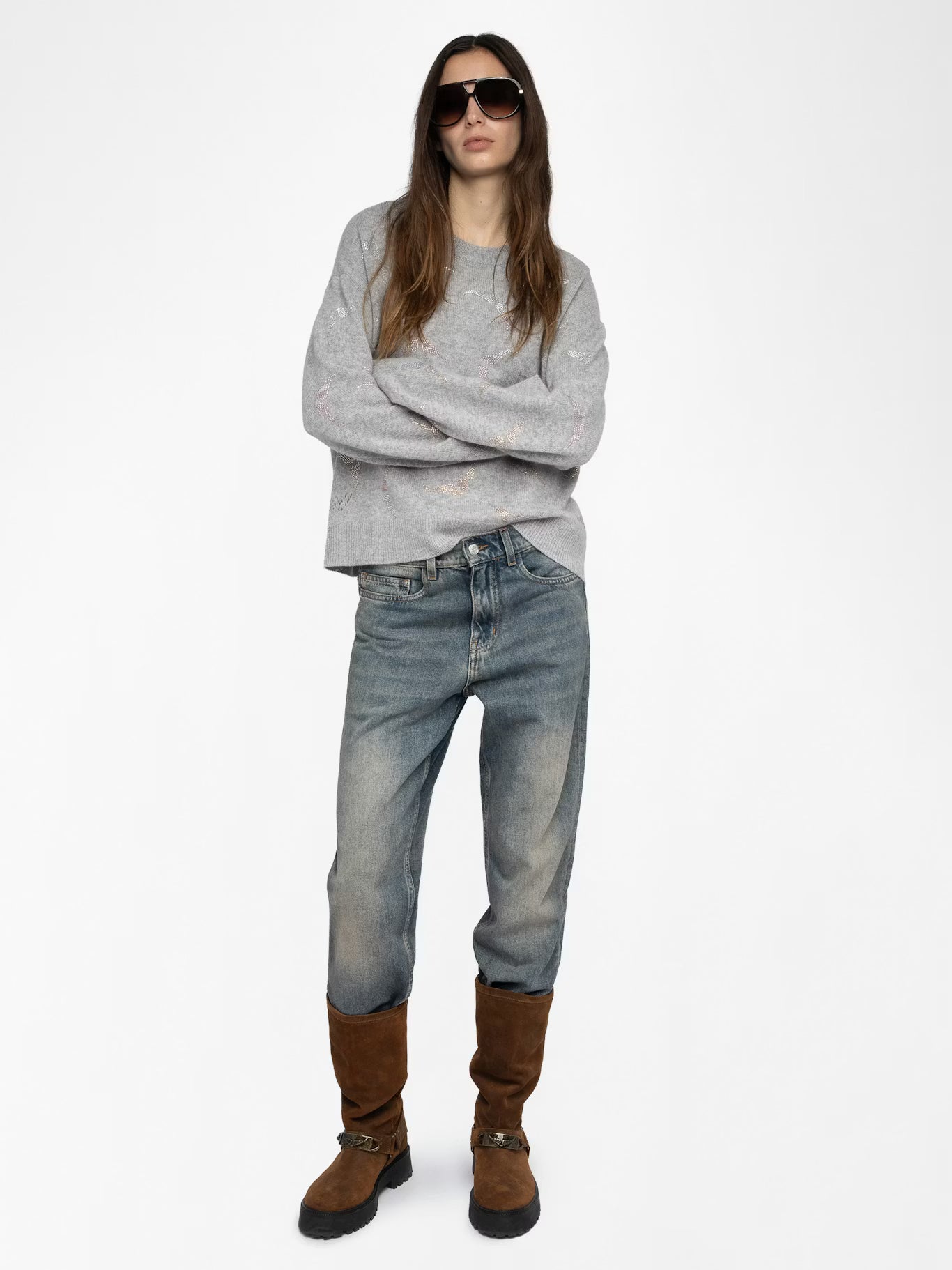 Svetr s kulatým výstřihem a křidélky z kamínků.