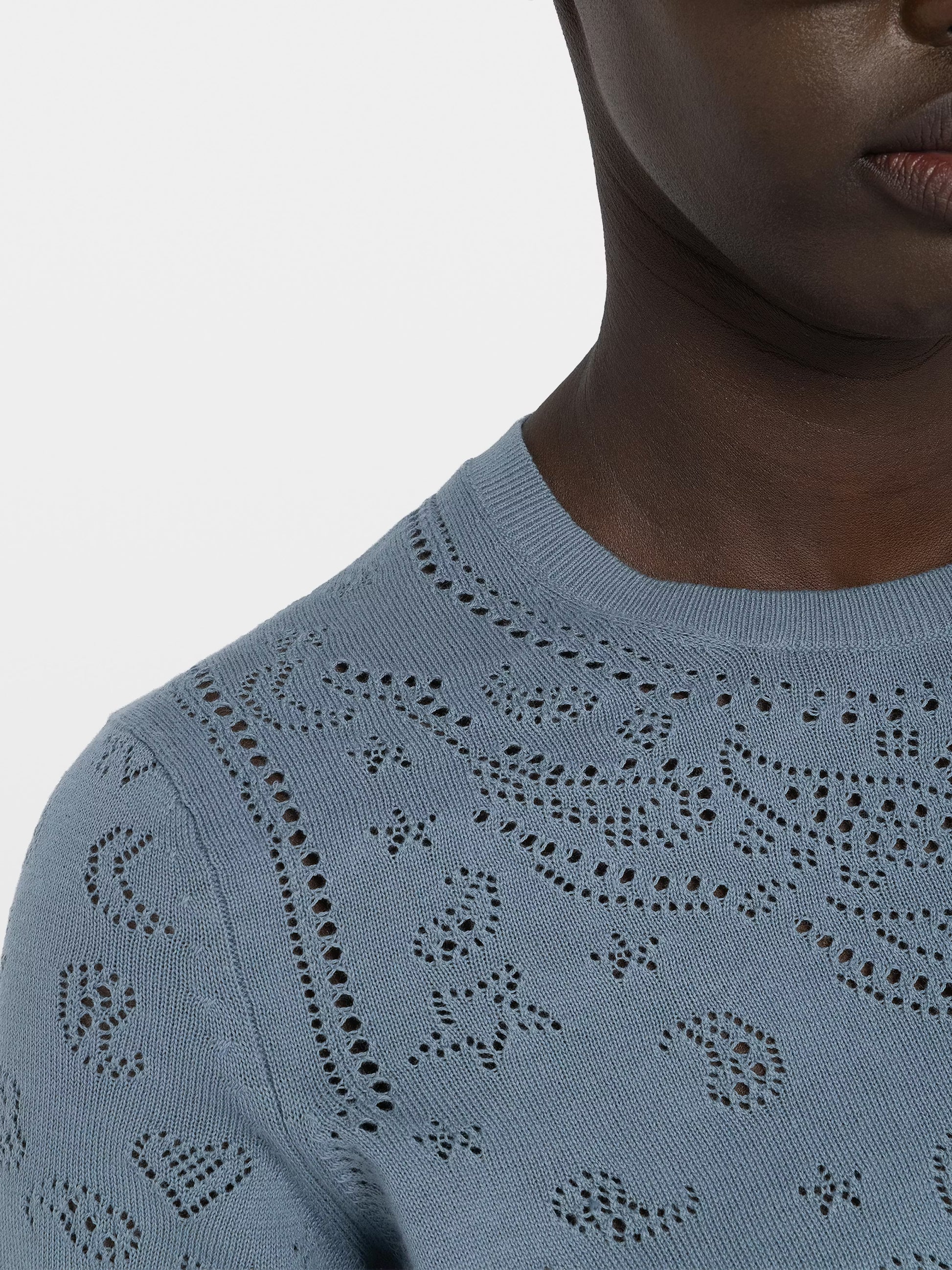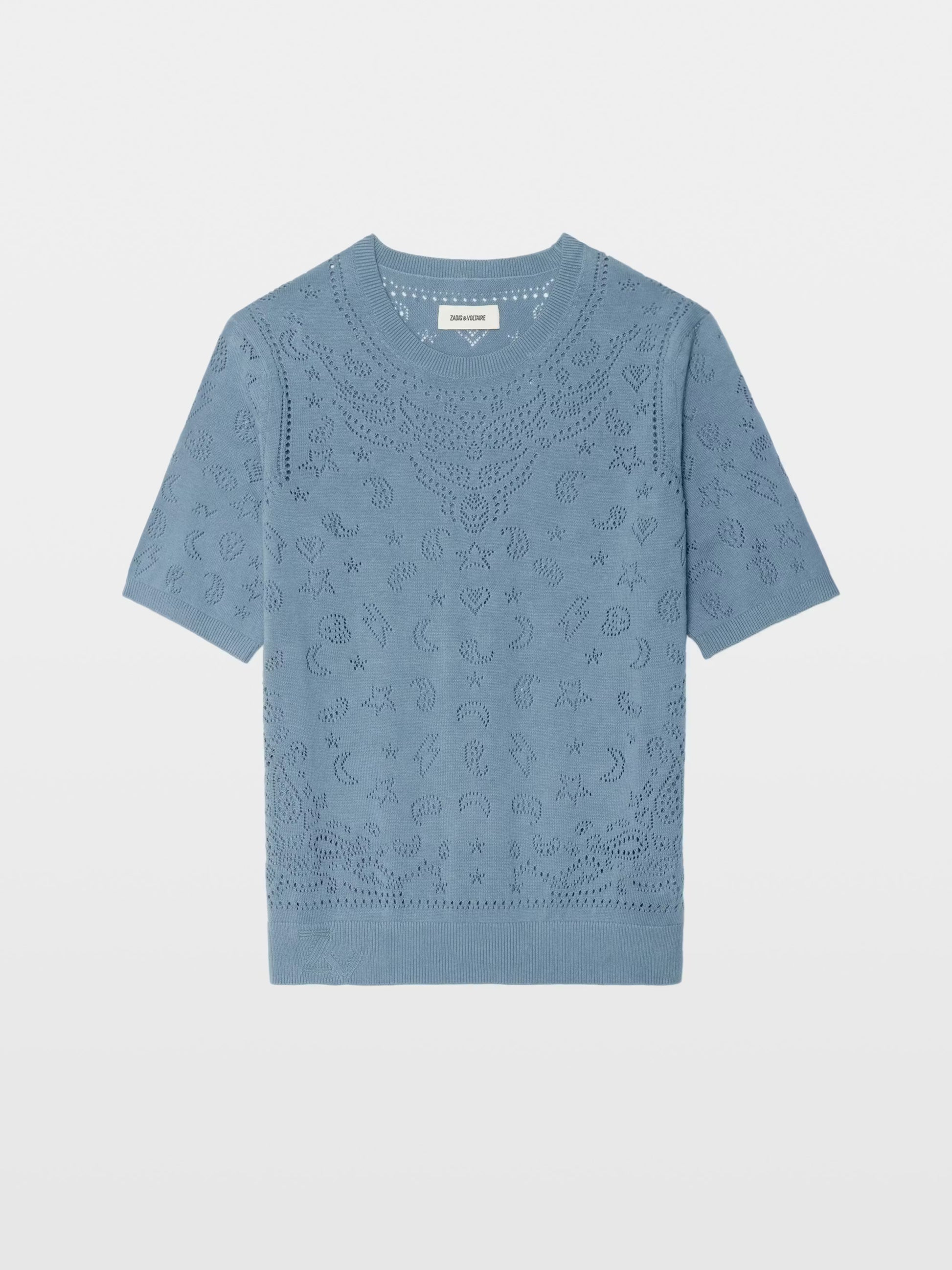 Svetr s kulatým výstřihem, krátkými rukávy a špičatými detaily.
