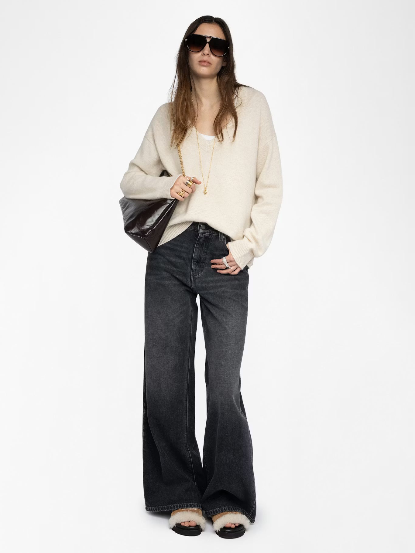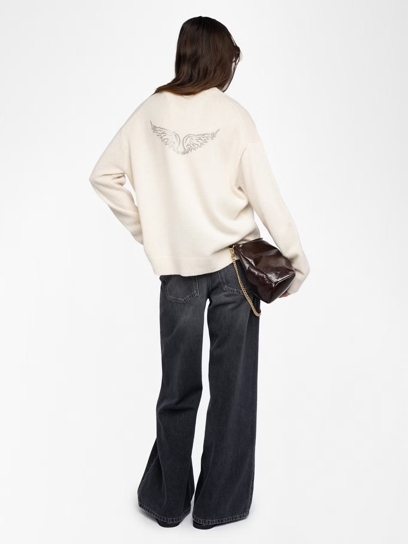 Svetr s výstřihem do V a kamínkovým křídlem na zádech.