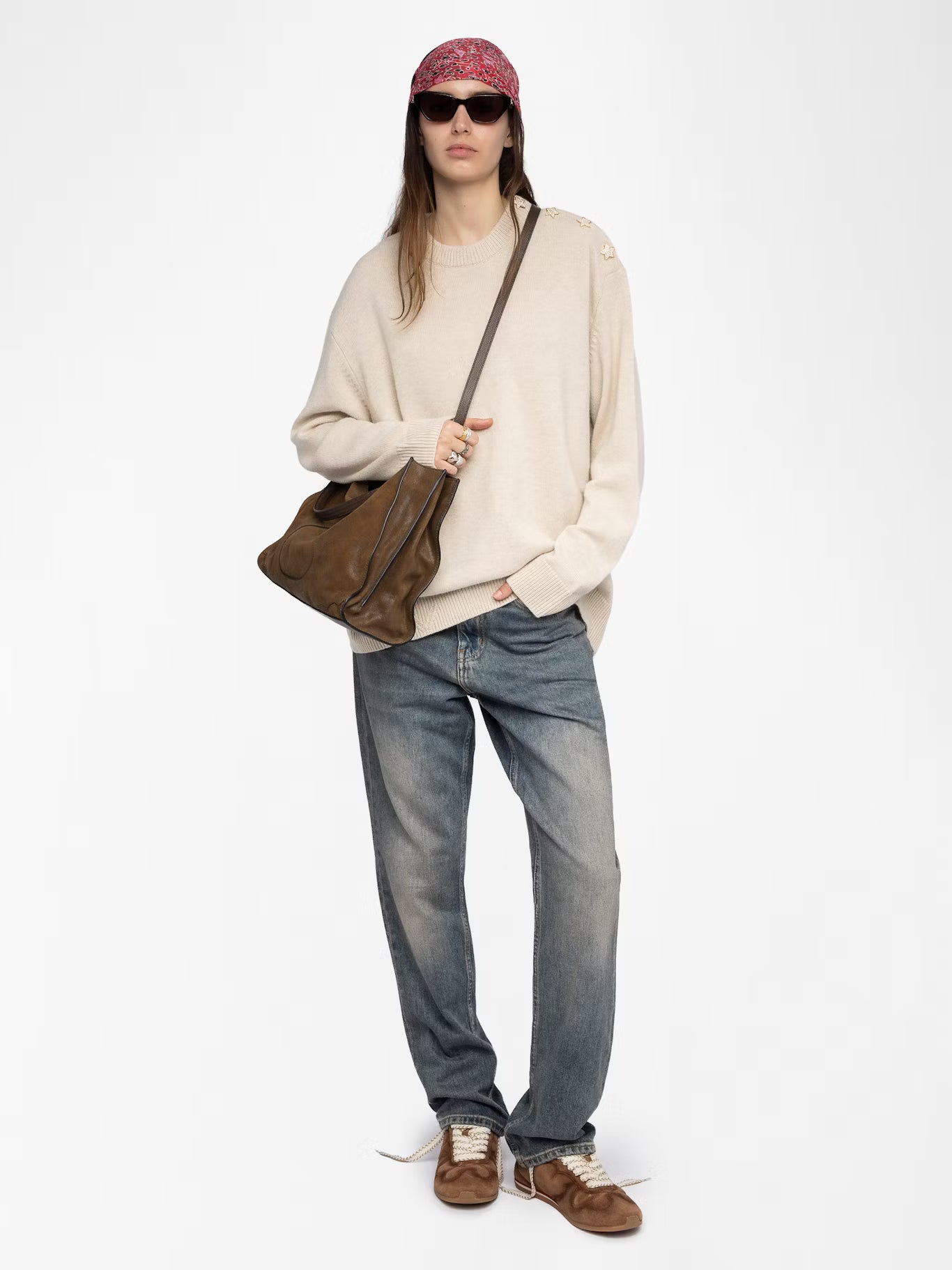 Volný svetr s kulatým výstřihem a zdobenými knoflíky.