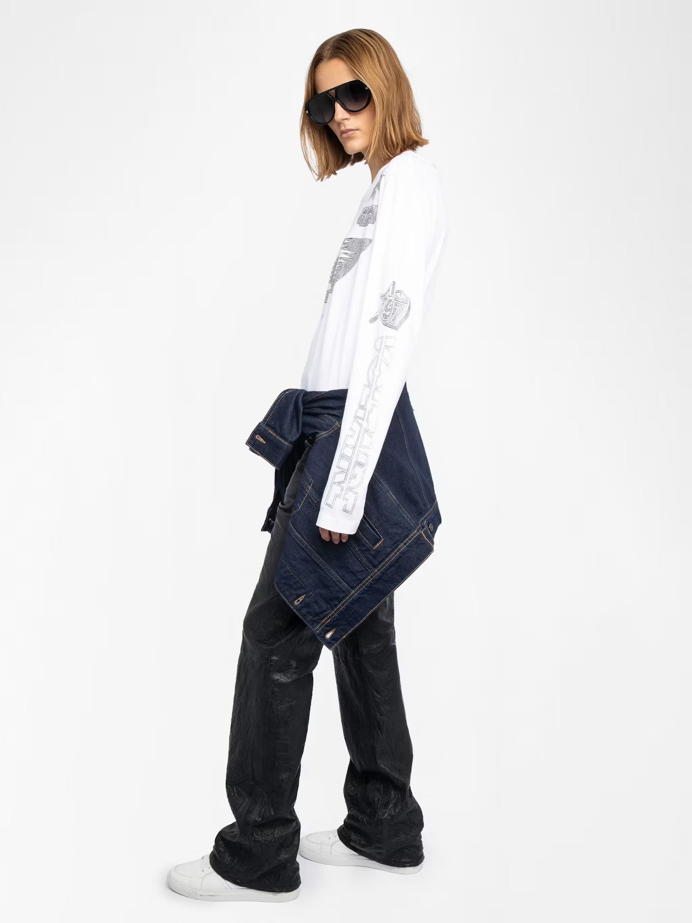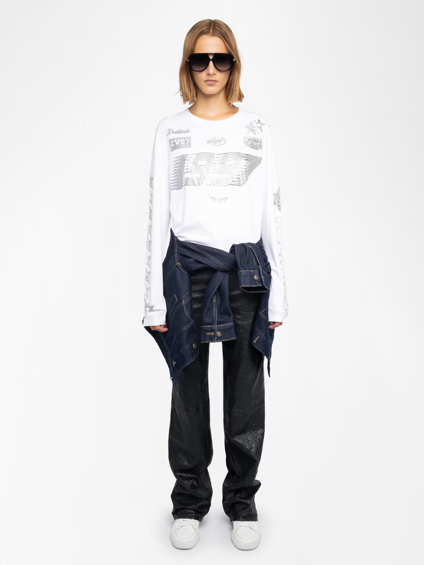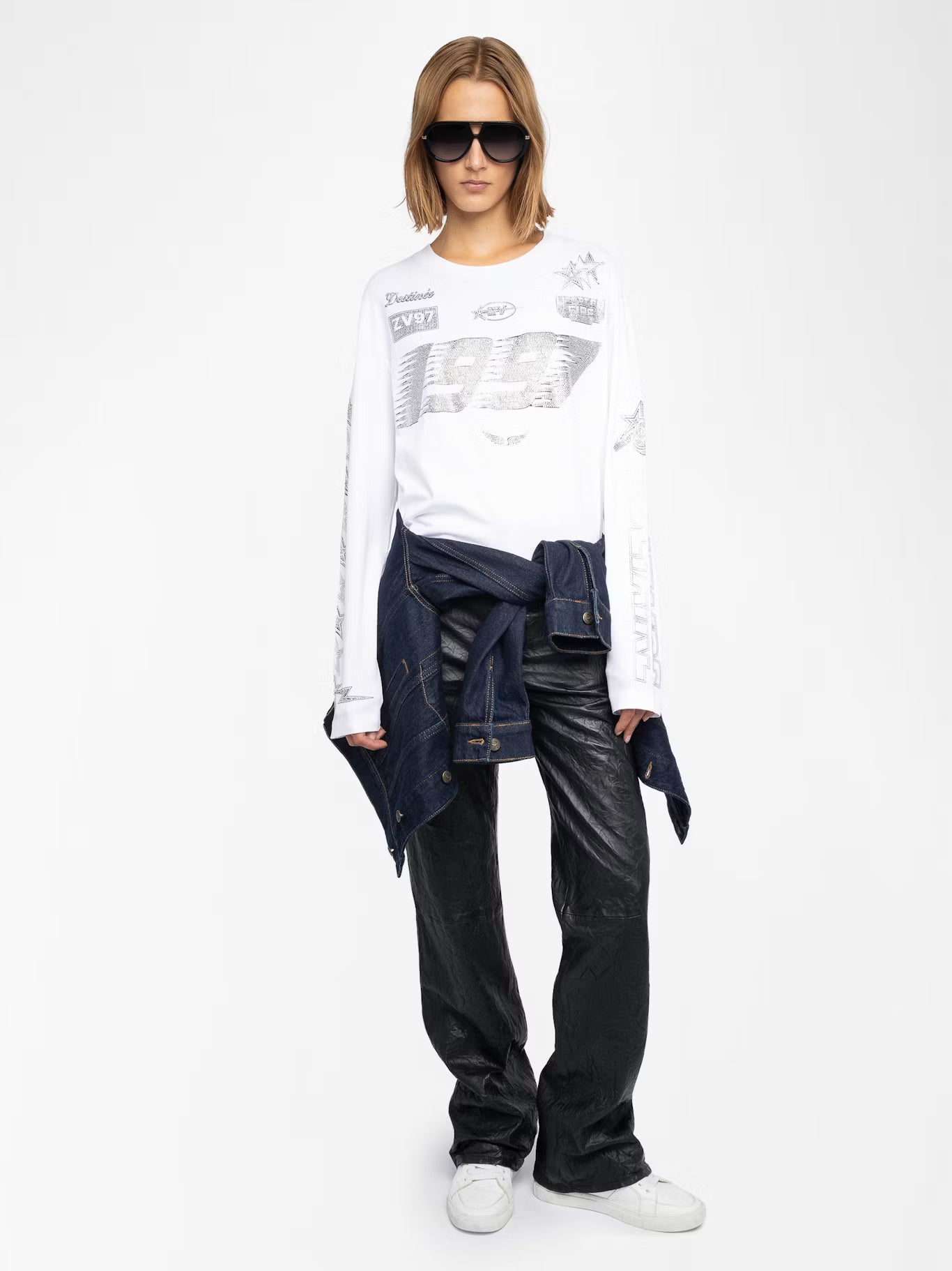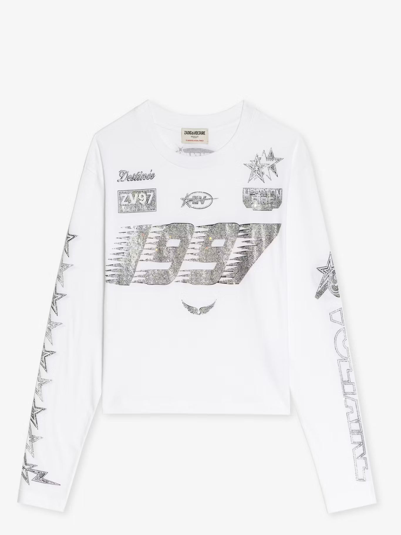 Krátké tričko s dlouhým rukávem, kulatým výstřihem, potiskem a kamínky.