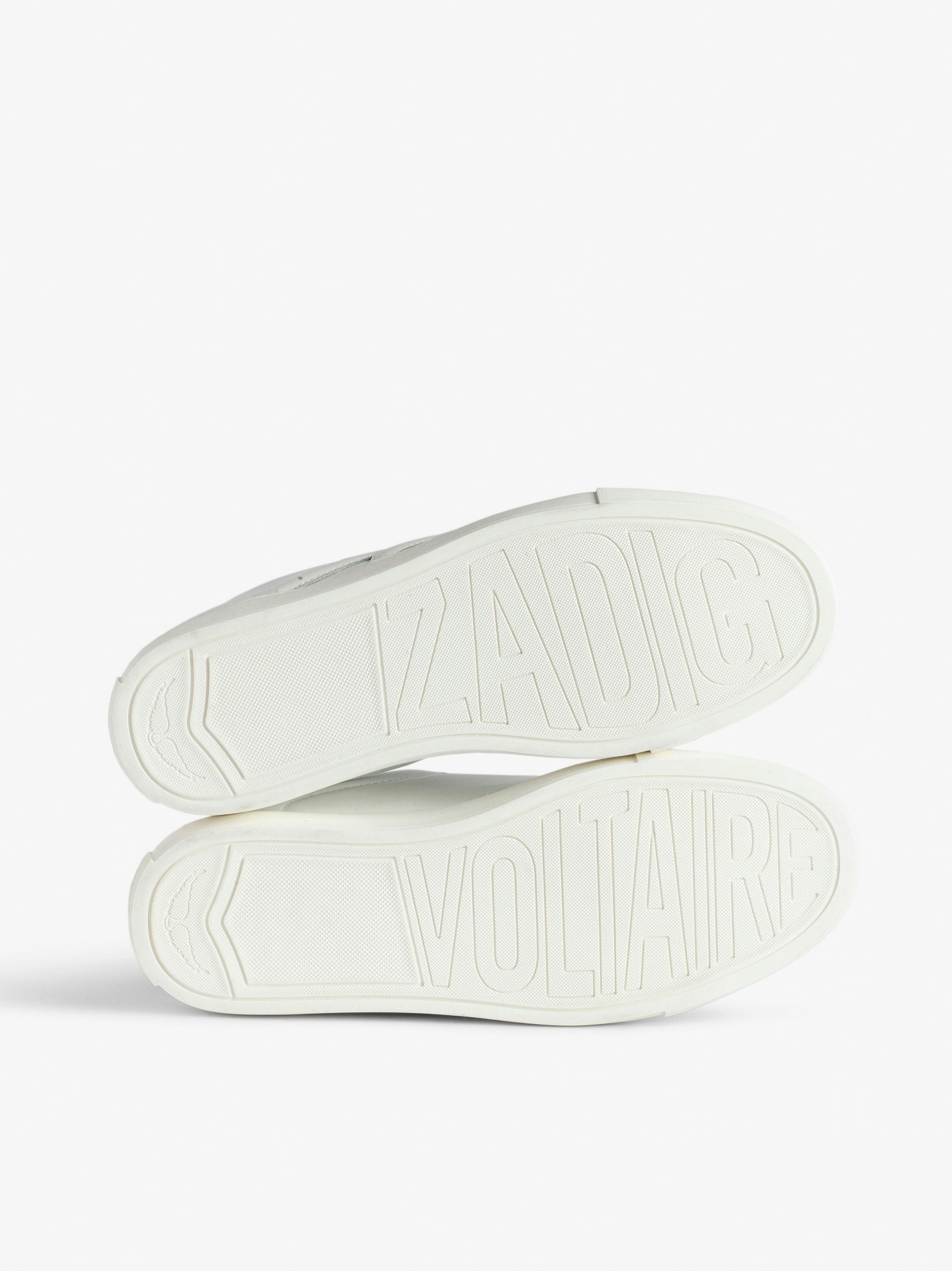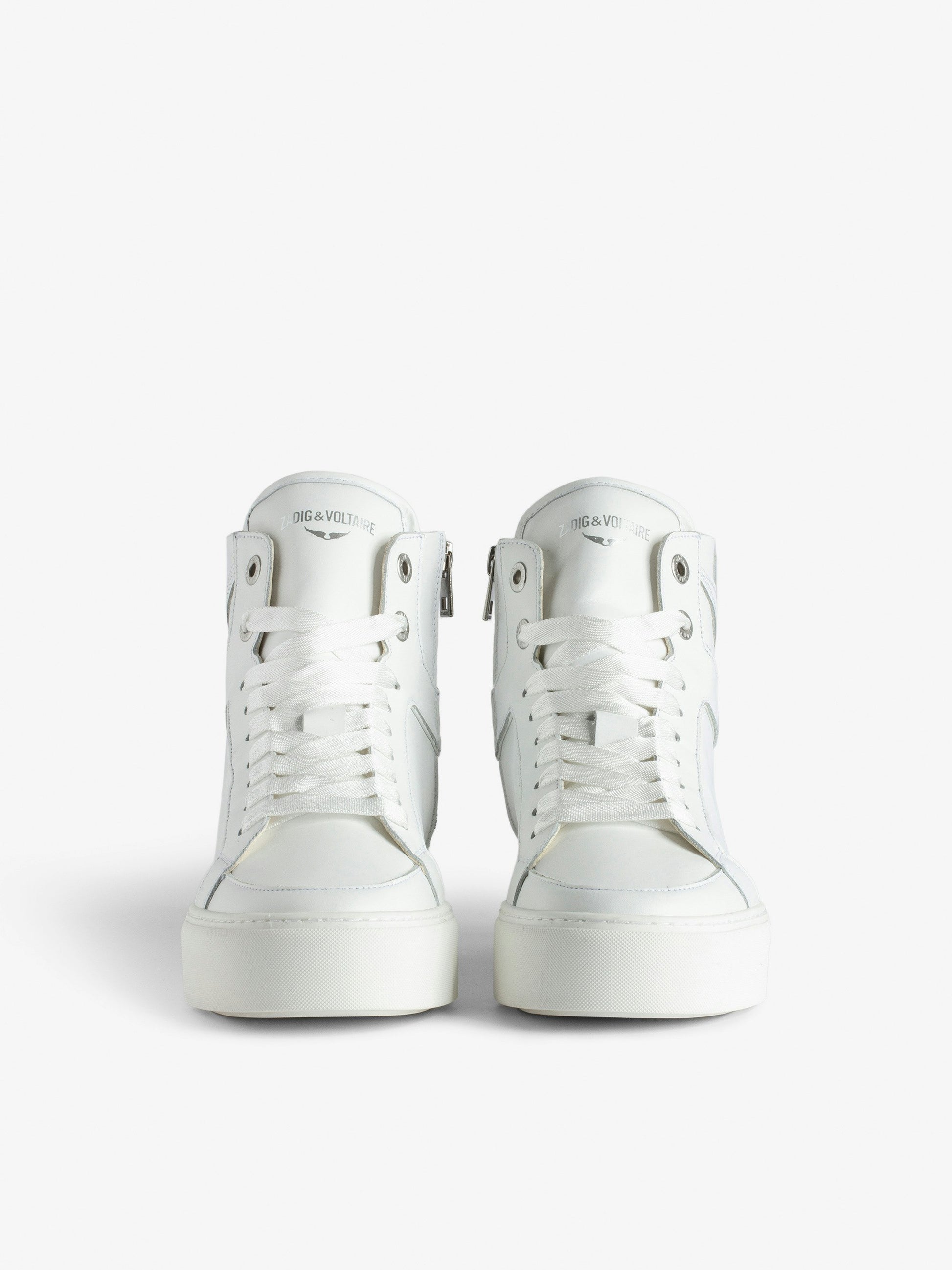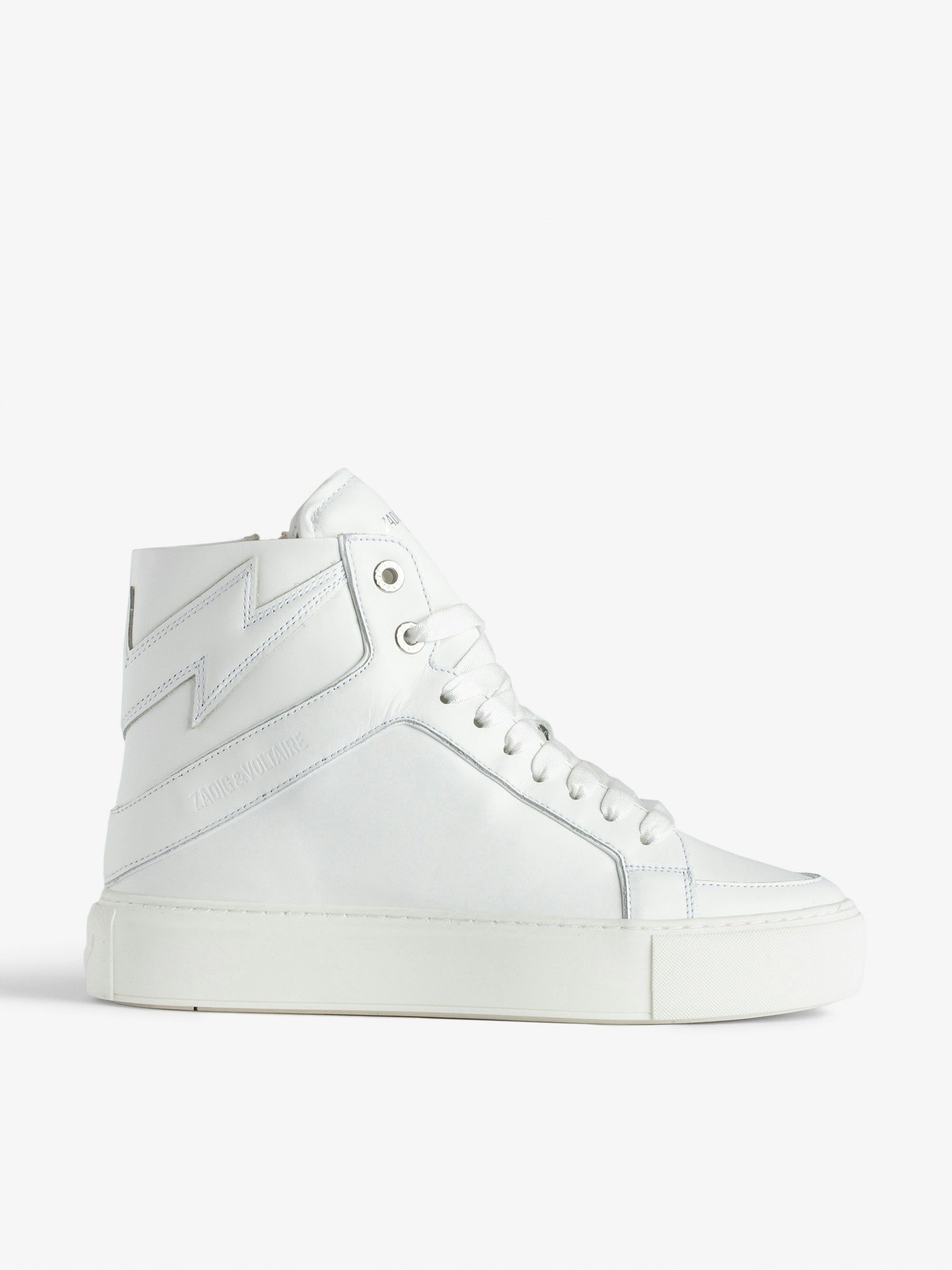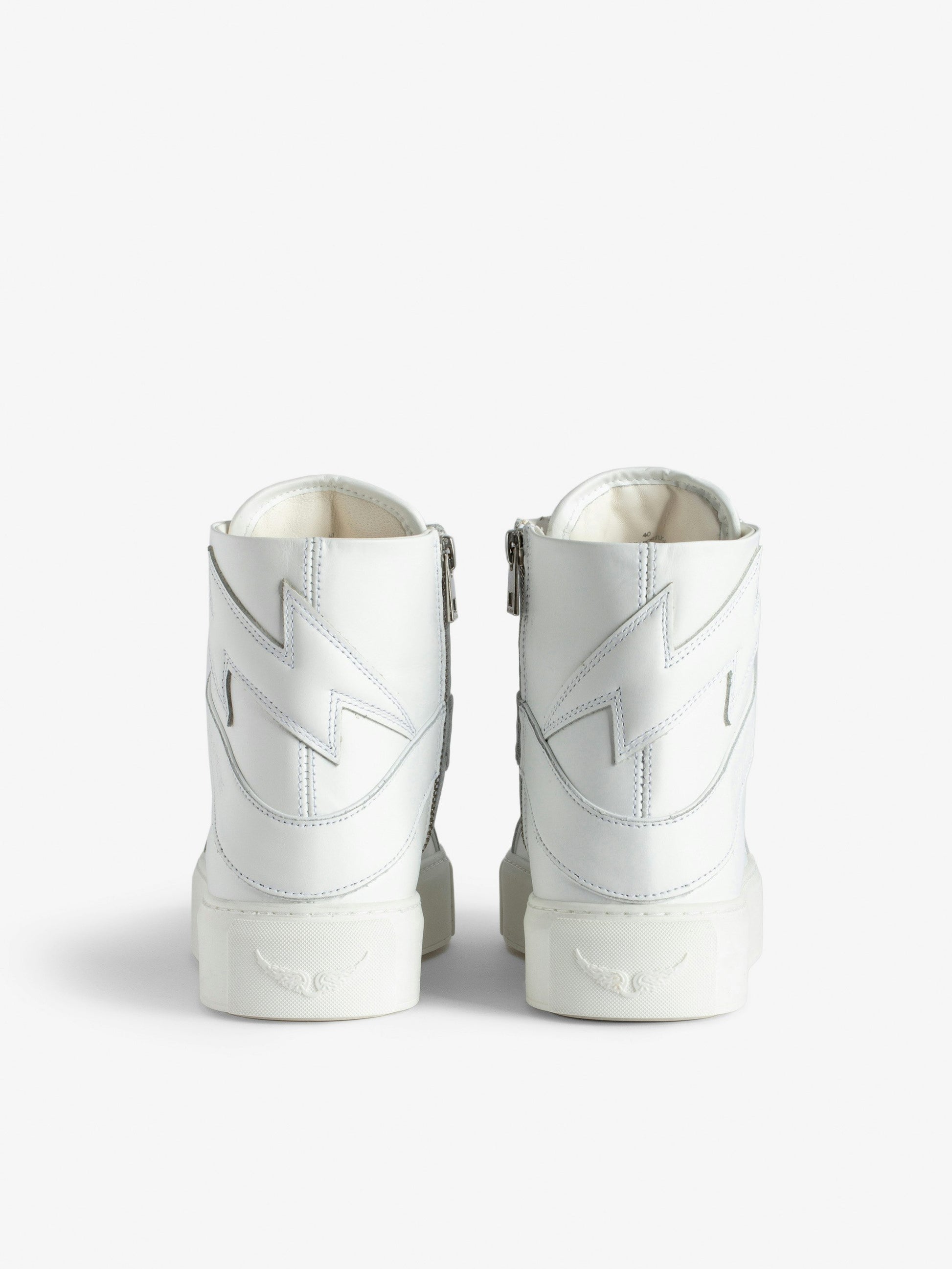 Women’s white smooth leather high-top trainers with lightning bolt panels and chunky sole.
